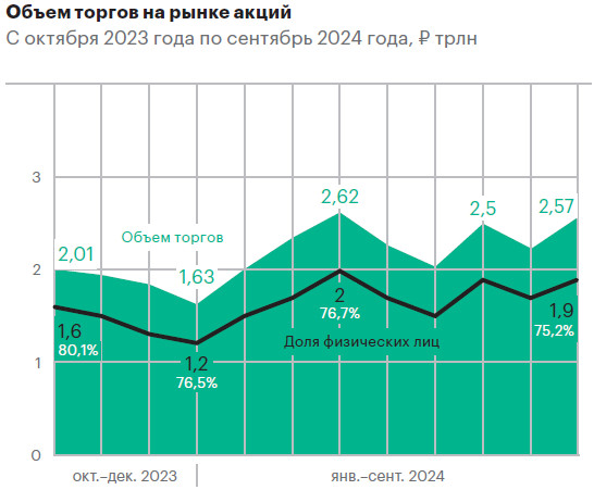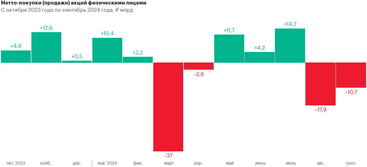 На фоне высоких ставок в марте 2024 года розничные инвесторы впервые с ноября 2022 года перешли к нетто-продажам акций и стали по итогам месяца крупнейшими продавцами бумаг на сумму 37 млрд руб., отмечал ЦБ в обзоре рисков финансовых рынков. В последующие месяцы акции также активно продавали нефинансовые организации (например, в мае продали больше всего акций за два года — на 44,4 млрд руб.) и нерезиденты. К осени ситуация не улучшилась: по итогам сентября физические лица сократили объем инвестиций в акции на 10,7 млрд руб.