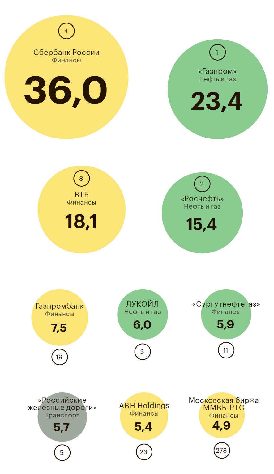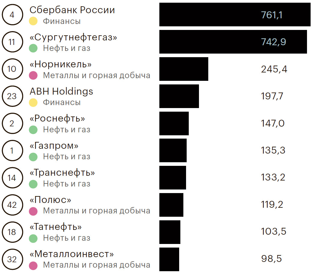 Состав топ-5 компаний рейтинга ни разу не обновлялся за время его существования — неизменно эти места с редкими перестановками занимают «Газпром», «Роснефть», ЛУКОЙЛ, Сбербанк и РЖД. Аналитики ранее связывали такую «стабильность» в топ-5/топ-20 с недостатком конкуренции, излишне зарегулированной средой, а также избыточным доминированием компаний с госучастием.