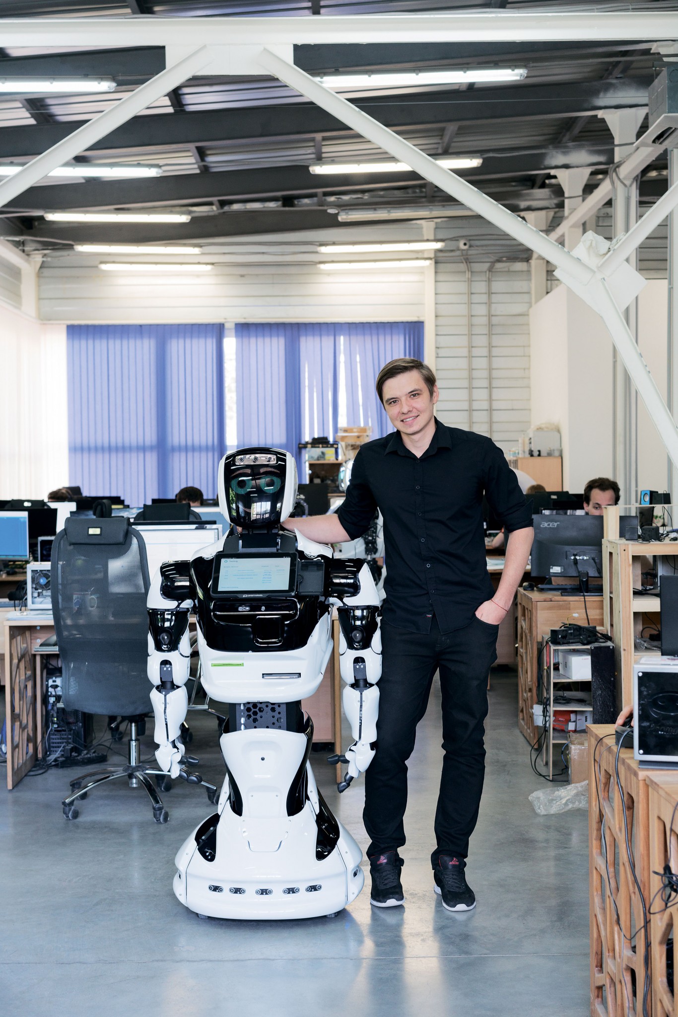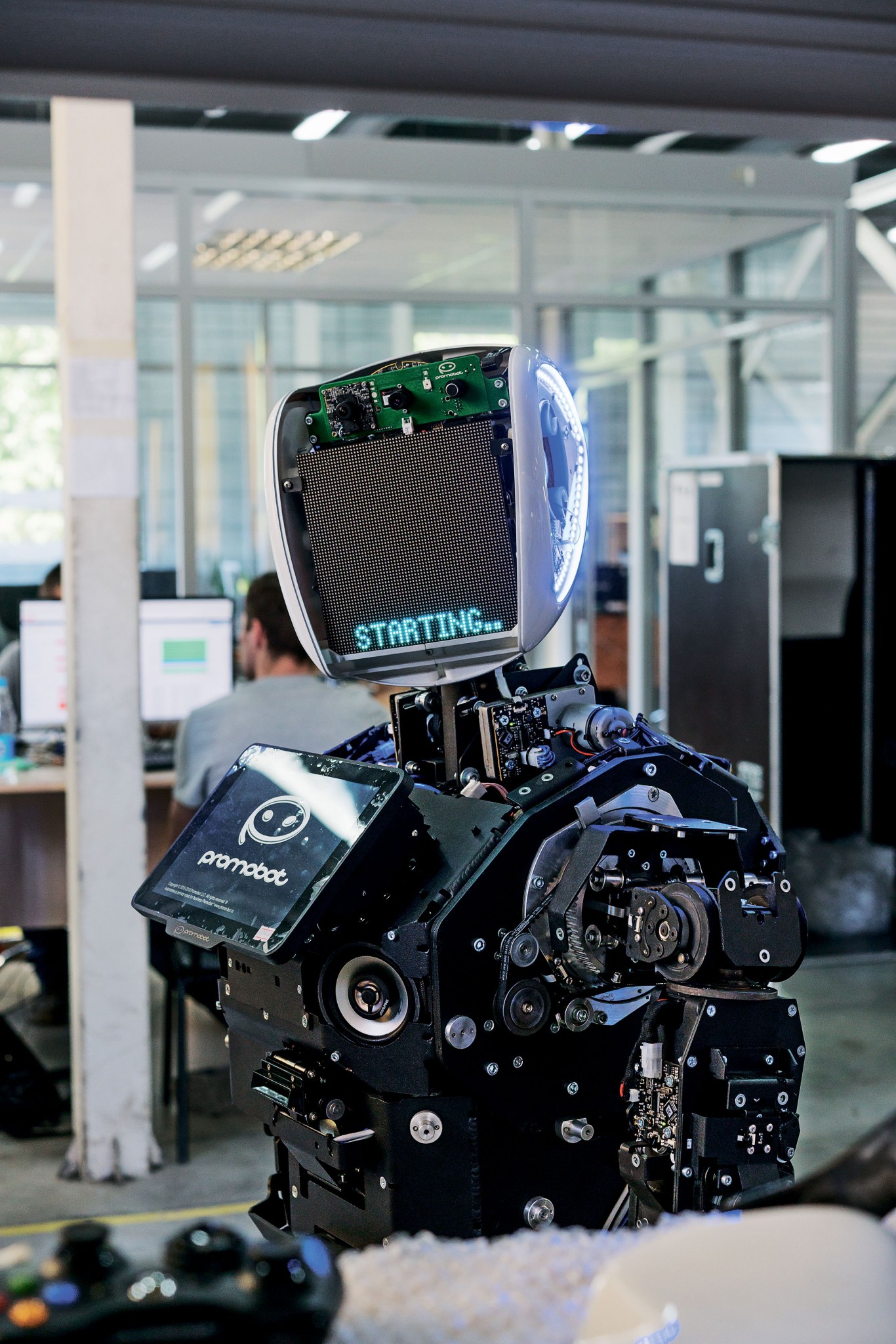 Нынешний офис Promobot находится недалеко от центра Перми, сотрудники сидят вплотную друг к другу — в помещении есть прозрачная «переговорка», но отдельных кабинетов не видно. На 600 кв. м работают 68 человек, в здании сильно пахнет клеем и пластиком — роботов собирают тут же. Они передвигаются среди людей, на некоторых наклеены записки «не трогать», «не вынимать батарею»: так тестировщики механики предупреждают программистов, что робот занят и в него нельзя загружать новый софт, объясняет Кивокурцев. В сентябре компания переедет в другой офис, также недалеко от центра, площадью уже 2 тыс. кв. м. Снять недорогой офис на окраине Promobot не может: «Не у всех разработчиков есть машины, а тратить много времени на дорогу они не хотят».