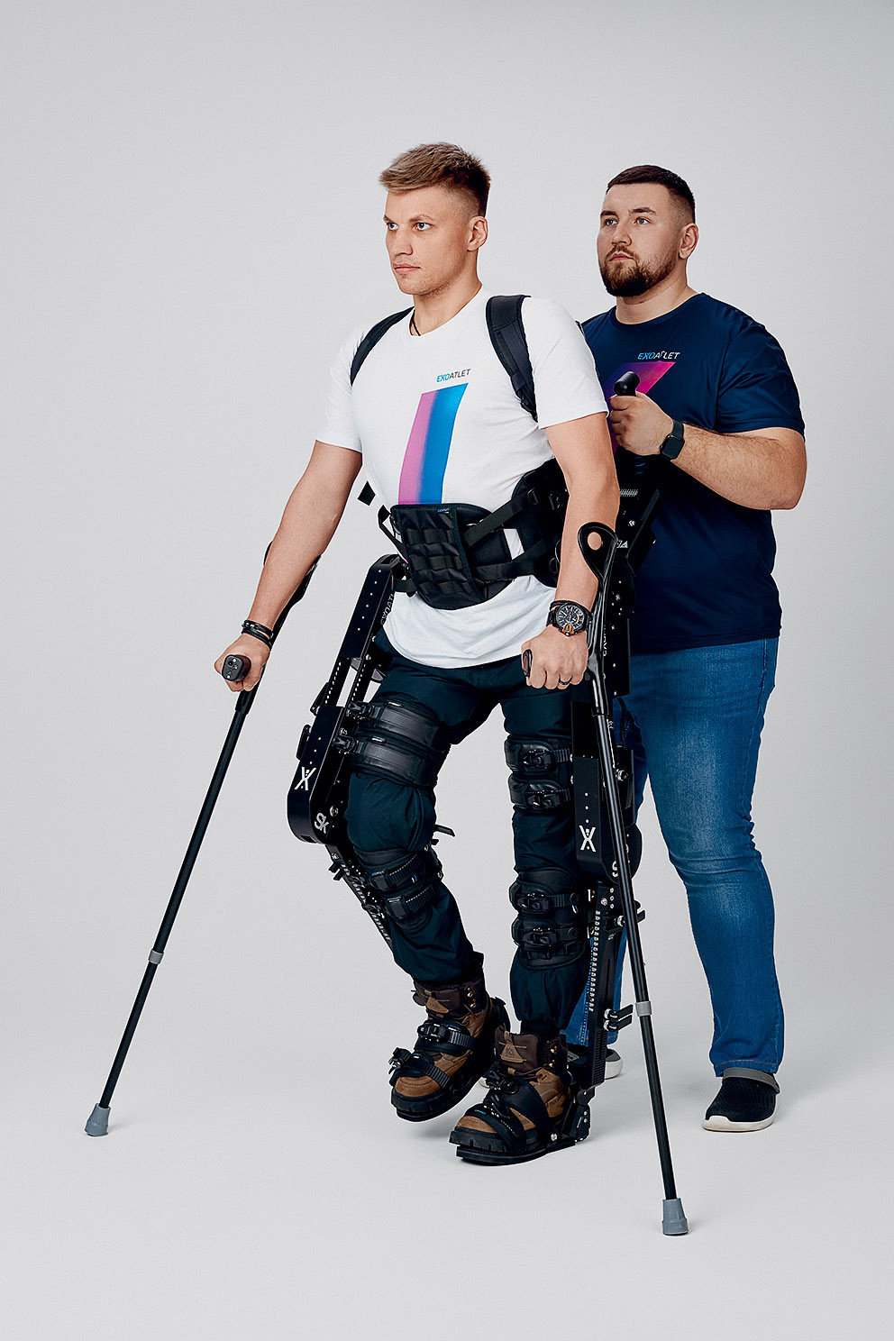 Российская компания ExoAtlet предлагает медицинские экзоскелеты для реабилитации пациентов с травмами ног, заболеваниями опорно-двигательного аппарата или нервной системы, а также после инсультов. Устройства управляются при помощи кнопок, расположенных на костылях, а также от планшета сопровождающего человека и приводятся в движение благодаря сигналам от силомоментных датчиков и электромиограммы — то есть считыванием электрической активности мышц. Алгоритмы устройства и встроенные приводы повторяют естественную ходьбу человека.