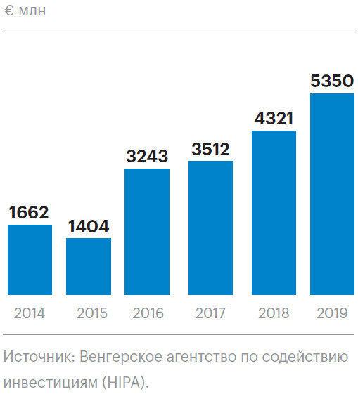 В период с 2013 по 2019 год средние темпы роста венгерской экономики (3,8%) превышали показатели Евросоюза (1,8%) и Вышеградского региона (3,1%), по данным Центробанка Венгрии. Коэффициент добавленной стоимости на единицу продукции (44%) в стране растет с 2011 года и превышает средний уровень Вышеградского региона.