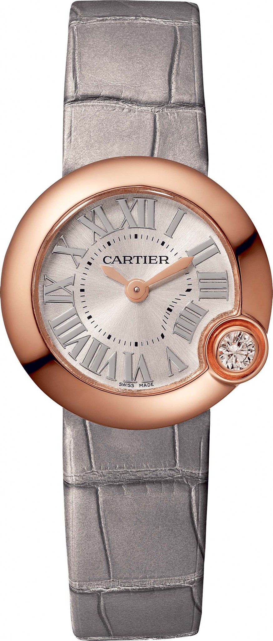 Новую главу в коллекции Ballon de Cartier открывает изысканная женская линия Ballon Blanc. Вместо синего сапфира безель часов украсил бесцветный бриллиант (отсюда и название линии «Белый шар»). Камень круглой огранки весом 0,14 или 0,16 карата (в зависимости от размера корпуса) расположен около 4-часовой отметки, образовавшуюся «выпуклость» аккуратно огибает цепочка серебристых римских цифр на циферблате с узором «солнечные лучи». Стрелки сохранили форму мечей, но теперь сделаны не из вороненой стали, а с покрытием из розового золота. Из розового металла исполнен и корпус диаметром 26 мм или 30 мм, в который заключен кварцевый механизм. Новые Ballon Blanc de Cartier с простым безелем или украшенным дорожкой бриллиантов предлагаются на кожаном ремешке черного или серого цвета.