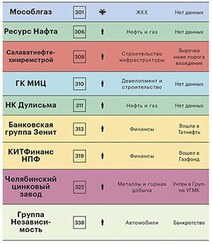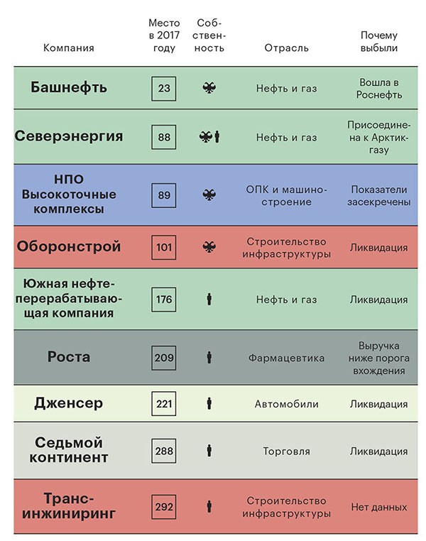 Самые крупные «потери» рейтинга — результат сделок по слиянию и поглощению: «Башнефть» вошла в состав «Роснефти», а «Северэнергия» присоединилась к «Арктикгазу». НПО «Высокоточные комплексы», создатель ракетно-пушечных и ракетно-артиллерийских комплексов («Искандер-М», «Панцирь С-1», «Игла-С») покинуло рейтинг, так как результаты его работы перестали быть публичными. У нескольких участников прошлогоднего рейтинга финансовую отчетность мы не смогли найти, использовав все доступные способы.