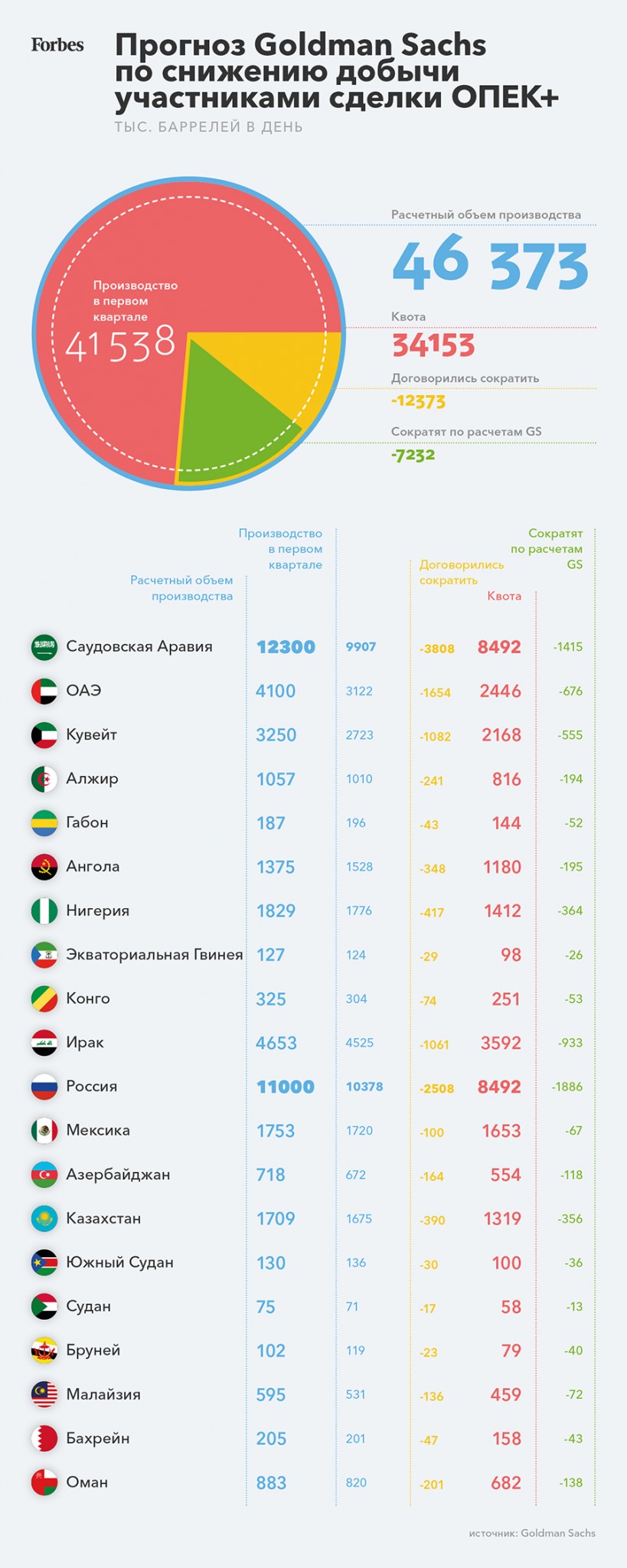 Страны ОПЕК+ договорились снизить добычу на 9,7 млн баррелей в сутки, но этого недостаточно — из-за пандемии, карантинов и остановившейся экономики спрос на нефть на мировом рынке упал почти на 20 млн баррелей в сутки. Физически страны-участники соглашения сократят меньше, чем заявлено, подсчитал Goldman Sachs.