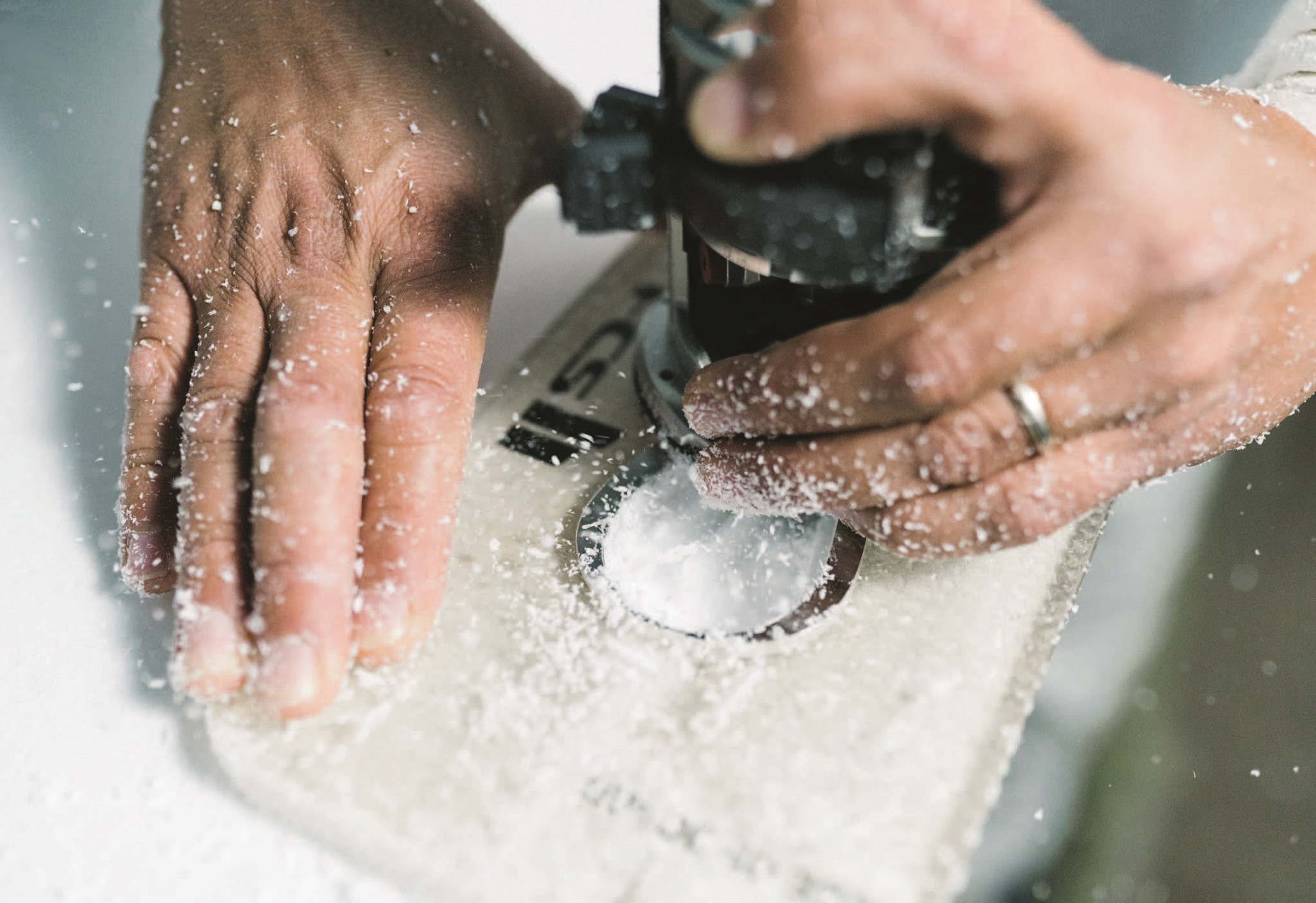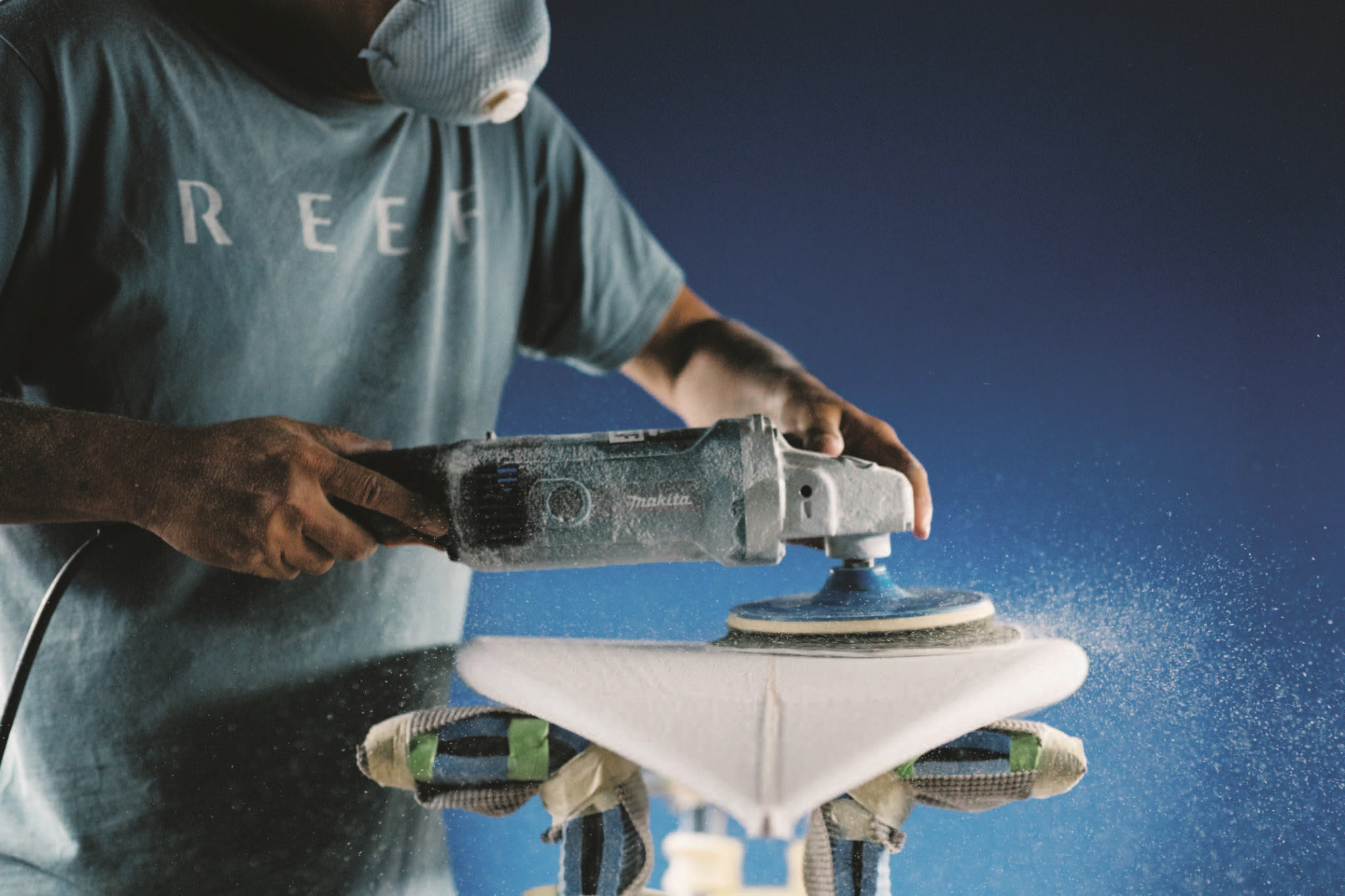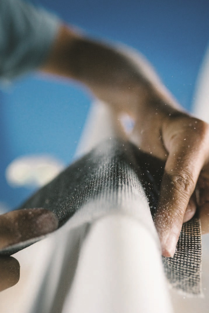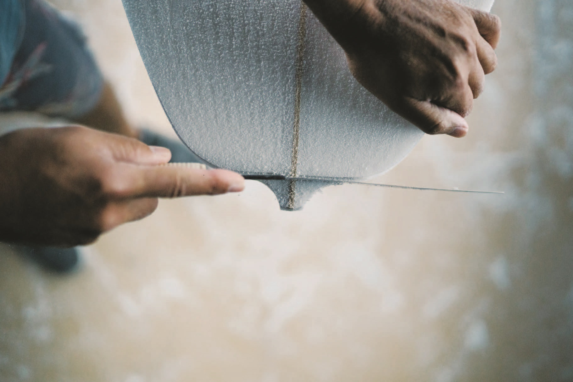 Ручная доводка. Шейперы доводят до совершенства свежевырезанную доску — тщательно зашкуривают пенополиуретан и проверяют, чтобы края, которые будут разрезать водную гладь, были правильной скруглённой или заострённой, в зависимости от вида борда, формы