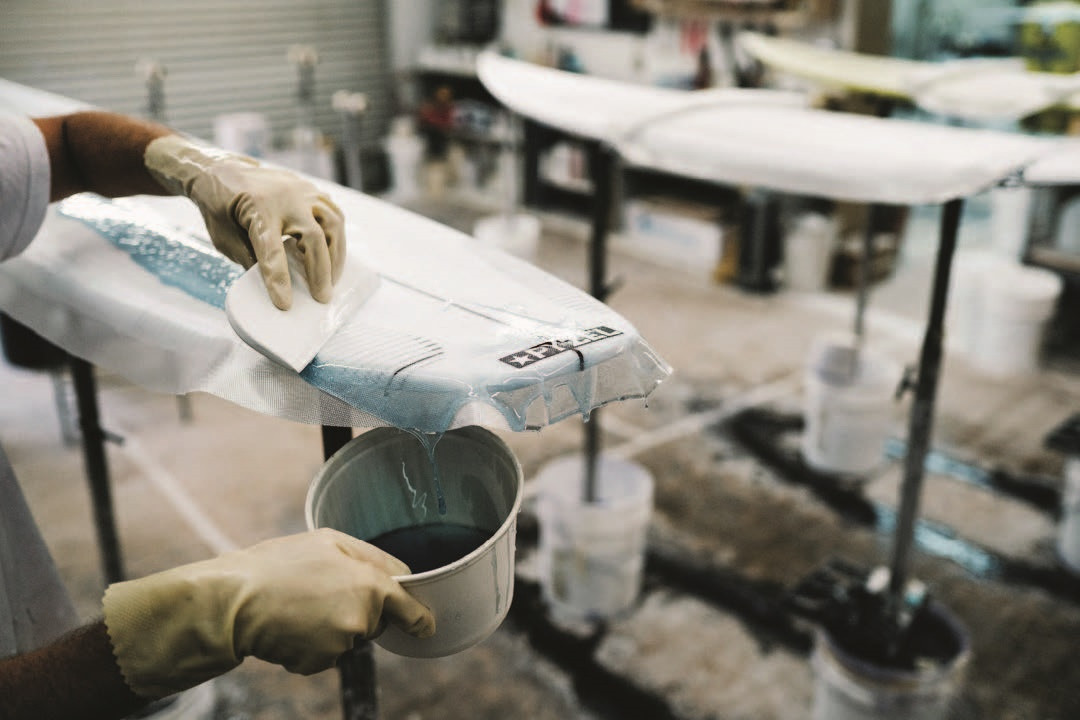 Зеркальная гладь. На этом этапе борд покрывают стекловолокном и эпоксидной смолой. Состав наносится на ткань и просачивается сквозь неё на доску, тем самым ламинируя её. Здесь важно действовать быстро и чётко, равномерно распределяя оптимальное количество смолы, чтобы доска сохранила лёгкость и податливость