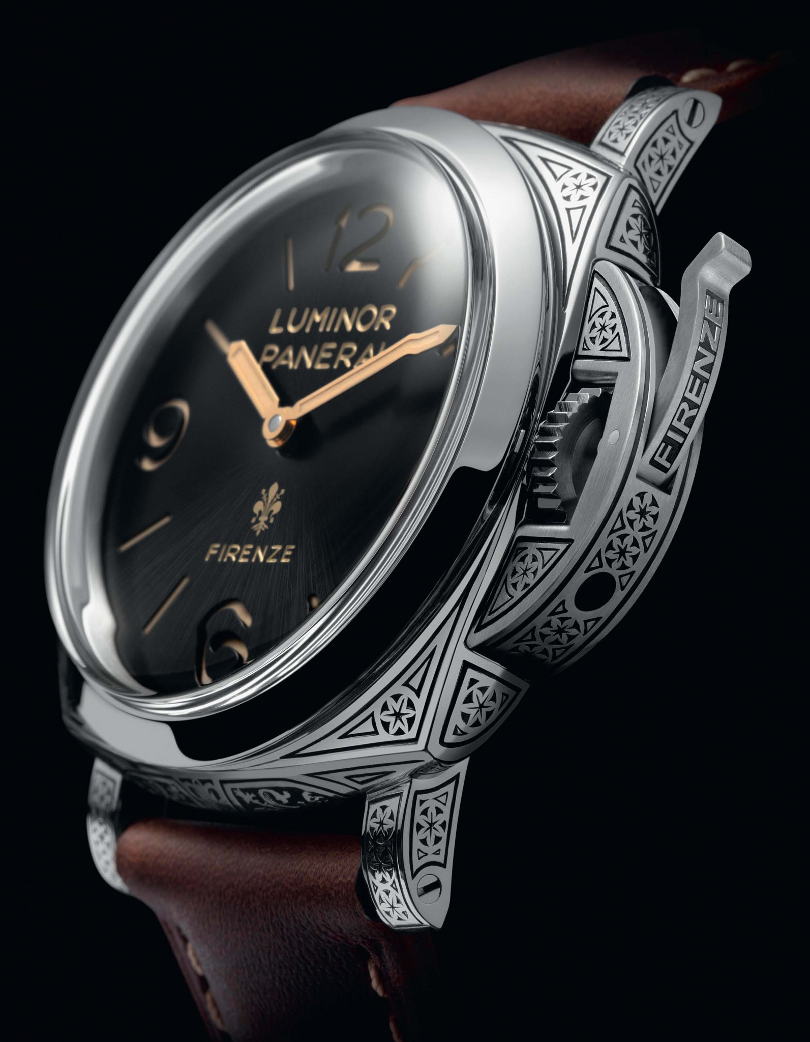 Модель Luminor 1950 в стальном корпусе, украшенном ручной гравировкой, эксклюзивно предназначена для исторического бутика Officine Panerai во Флоренции