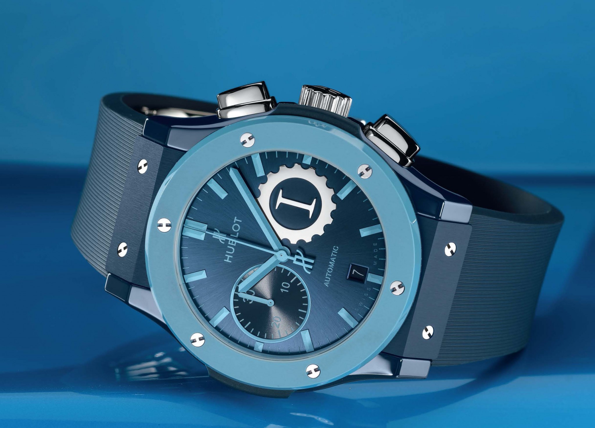 Новая коллаборация Hublot и Лапо Элканна — дизайнера, самого элегантного мужчины Италии и, last but not least, младшего брата главы концерна Fiat Chrysler Automobiles (кстати, братья Элканн приходятся внуками Джанни Аньелли, который считался богатейшим человеком в новейшей истории Италии). После нескольких совместных релизов часовой марки с компанией Italia Independent (к слову, тепло принятых публикой) пришла пора сотрудничества с очередным начинанием Лапо — дизайн-ателье Garage Italia, которое специализируется на индивидуализации различных транспортных средств. Часы в корпусе диаметром 45 мм из голубой и синей керамики и с логотипом партнёра (вписанной в зубчатое колесо литерой I) выходят серией из 100 экземпляров и станут первой частью трилогии Sky, Earth, Sea. Дебютная модель посвящена морской стихии, на что указывают лазурный цвет сатинированного циферблата и рисунок синего каучукового ремешка, символизирующий волны. Под задней крышкой из синей керамики работает