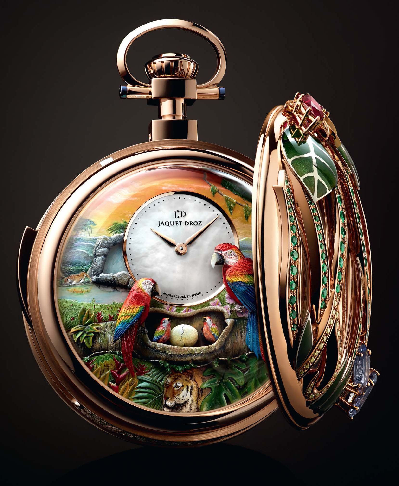 Выполненные в единственном экземпляре карманные часы олицетворяют все ценности марки, отмечающей в этом году 280-летие. В первую очередь это относится к автоматону — механической анимации, активируемой по требованию вместе с боем минутного репетира. В движение приходит как пара взрослых попугаев, так и птенцы, один из которых вылупляется из яйца. Отделке состоящего из 668 деталей механизма с ручным заводом уделено особое внимание. Циферблат расписан вручную, на задней крышке в техниках горячей эмали и paillonné изображён попугай ара, ажурная лицевая крышка инкрустирована драгоценными камнями. Отдельного упоминания заслуживает узел заводной коронки: в него встроен секретный замок, открывающий крышки, а кольцо даёт возможность подвесить часы на цепочке внутри расписанной вручную шкатулки.