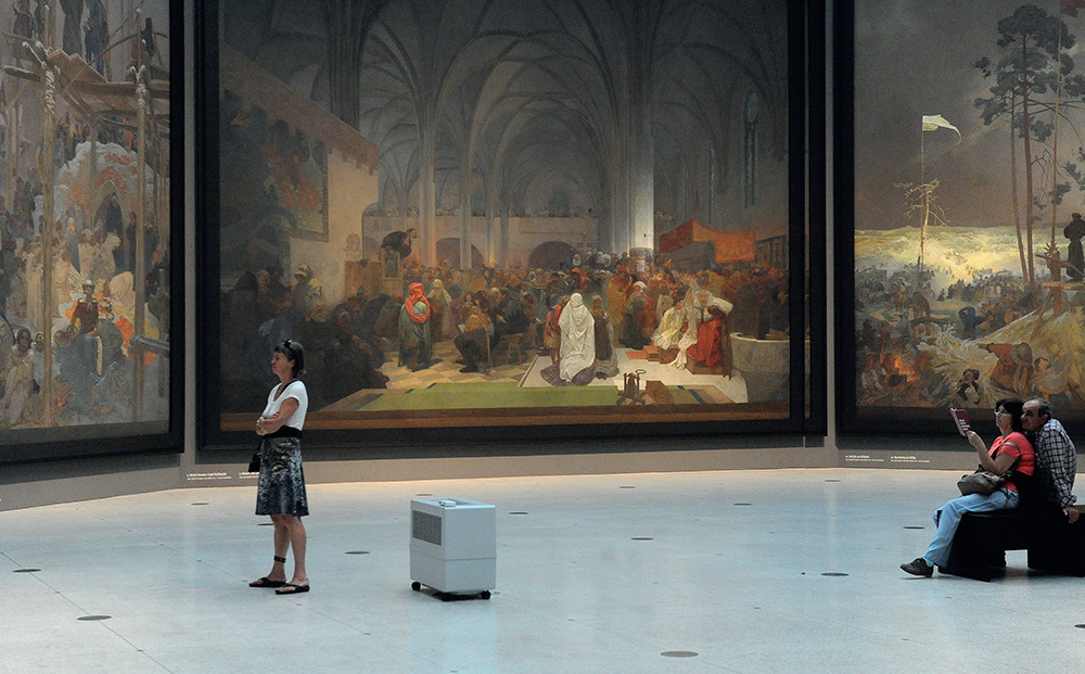 Когда Альфонс Муха в 1909 году задумал этот цикл, финансировать грандиозный проект согласился американский миллионер Чарльз Крейн. Над созданием масштабных полотен размером 6 на 8 метров Муха работал следующие 18 лет и впервые показал их в 1928 году во время празднования 10-й годовщины независимости Чехословакии. Мы больше знаем Муху как автора рекламных плакатов, ставших символом Прекрасной эпохи в Париже. Однако «Славянская эпопея» не такая: написанные на холсте батальные сцены, исторические сюжеты из прошлого чехов, русских и болгар, религиозные сцены — для Чехии цикл стал национальным достоянием. Художник передал картины Праге с единственным, но важным условием — построить для их экспонирования отдельный выставочный зал. Именно это и стало камнем преткновения. Первоначально картины выставили в Пражской национальной галерее, но во время немецкой оккупации их спрятали и позже перевезли на хранение в замок Моравский Крумлов в 200 км от Праги. Для публики картины были открыты только в 1963 году, так и оставшись в замке до 2010 года. В этот год широко отмечали 150-летие Альфонса Мухи, «Славянская эпопея» была внесена в список культурного наследия, и Прага захотела вернуть картины себе. Впервые возник судебный спор, в результате которого полотна перевезли в Выставочный дворец, построенный в 1920-х для торгов и ярмарок.