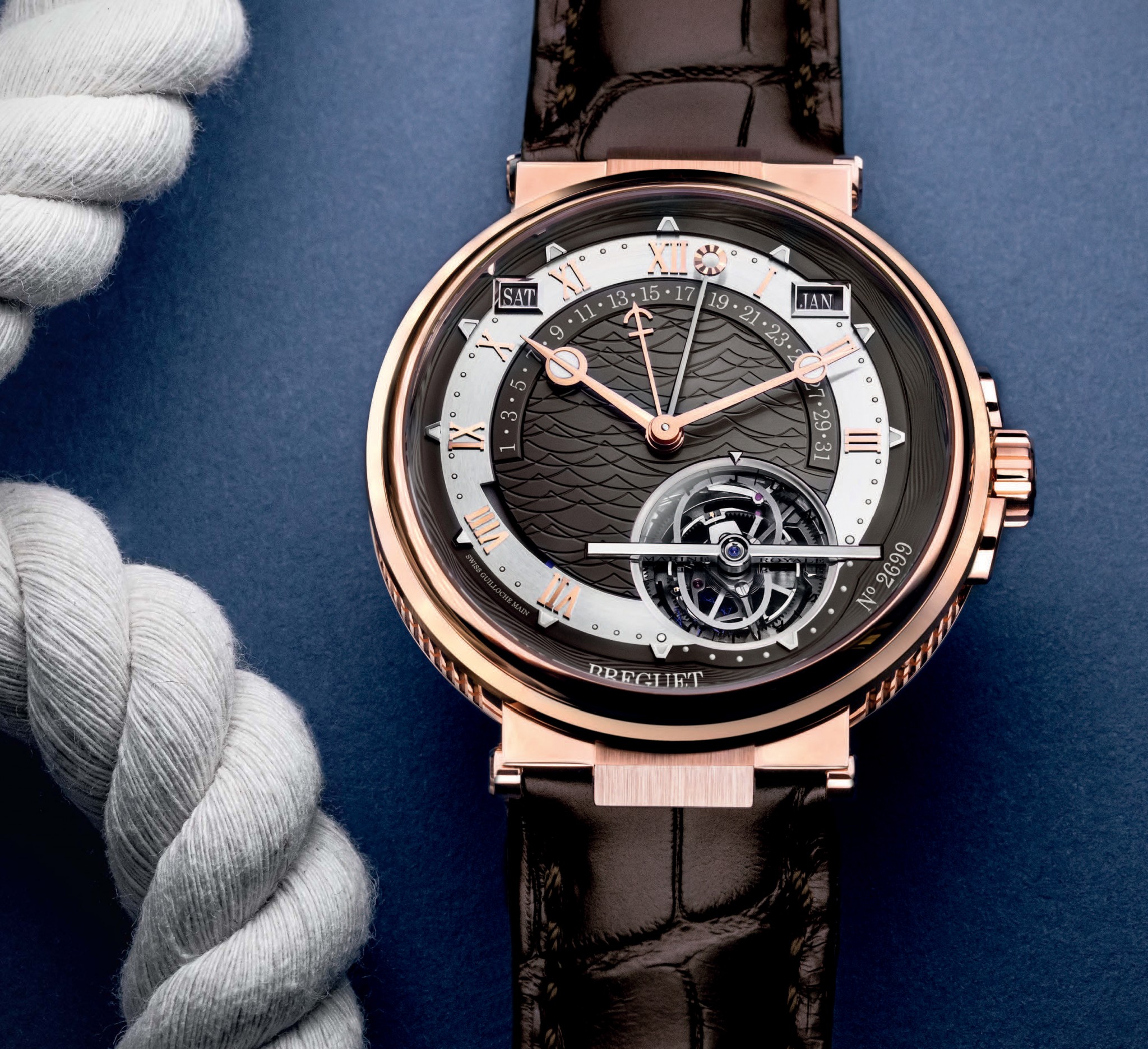 В морской коллекции Marine часы категории Grandes Complications с функцией бегущего уравнения времени, вечным календарём и турбийоном появились три года назад. Изначально они предлагались в платиновом корпусе. В 2018-м вышла версия в обновлённом дизайне и розовом золоте. Новые часы, хоть и выполнены в той же стилистике, но за счёт цветовых решений (золотых стрелок и индексов на сером циферблате и корпуса из розового золота) выглядят по-особенному. Уравнение времени напоминает нам, простым смертным, что разделение суток на 24 часа весьма условно. Совпадает общепринятое и солнечное время всего четыре раза в году, а вообще разница достигает от –16 до +14 минут. В модели 5887 уравнение времени решается за счёт дополнительной минутной стрелки с солнечным диском на конце. Под корпусом трудится калибр Breguet 581DPE с 80-часовым