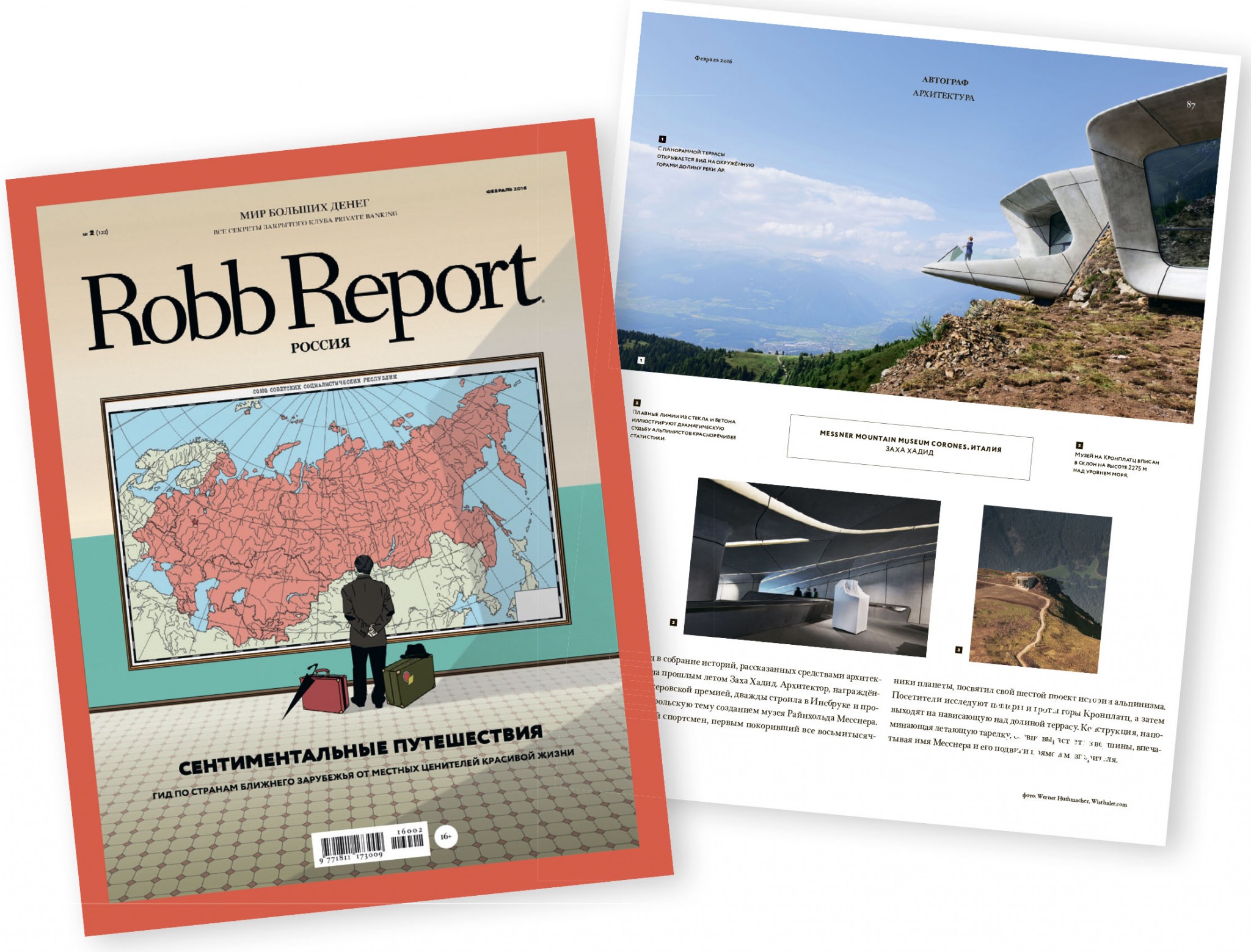 В подборку самых экстравагантных архитектурных проектов, опубликованных в феврале 2016 года, вошёл музей легендарного альпиниста Райнхольда Месснера на горе Кронплатц в Италии, построенный по проекту архитектора Захи Хадид,