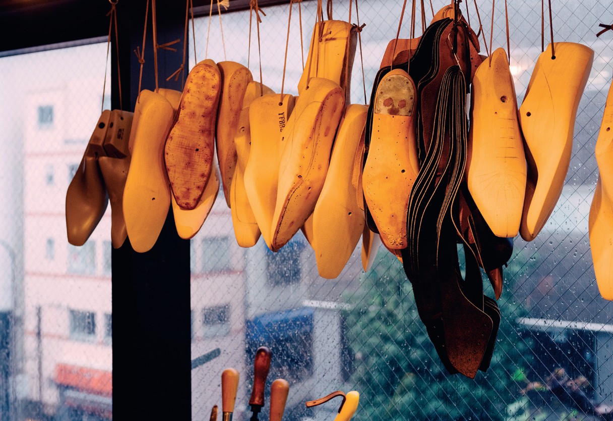 Если подняться по узкой лесенке элегантного здания в квартале Аояма, попадёшь в царство Йохеи Фукуды, достойнейшего обувщика Азии, если не мира. Улыбчивый, внимательный Йохеи с опрятной бородкой клинышком проходил обучение у Edward Green в английском городе обувщиков Нортгемптоне, а затем работал в одном из лучших лондонских обувных бутиков George Cleverley. Собственную компанию он основал в 2008 году, делая обувь на дому, а в 2011-м открыл магазин в Аояме. Теперь у него самого ученики