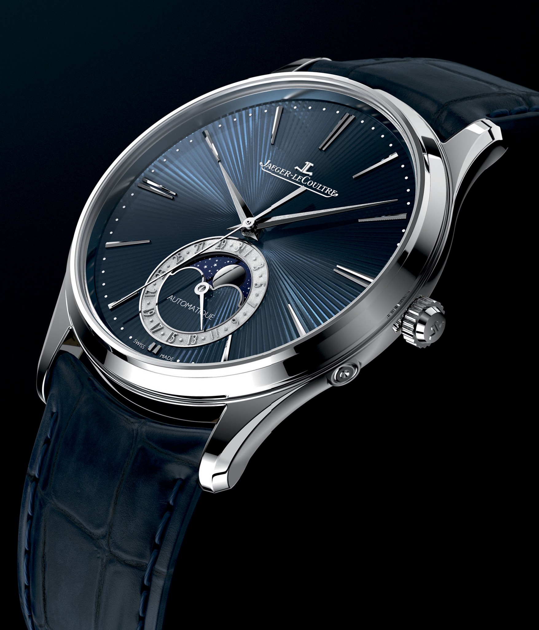 Премьерная модель интересна прежде всего своим циферблатом, для отделки которого использованы сразу две редкие художественные техники: гильоширование и эмалирование. Диск циферблата сначала вручную украшается узором в виде концентрических линий, а затем покрывается — разумеется, также вручную — полупрозрачной синей эмалью. Корпус диаметром 39 мм сделан из стали, что позволяет надеяться на сохранение цены на демократичном для часов таких достоинств уровне. Автоматический механизм JLC Калибр 925 относится к категории тонких, что сказалось на общей толщине корпуса: она составляет 10,04 мм. Модель с указателями даты и фаз Луны представлена ограниченной 100 экземплярами серией. Пара других моделей линии Master Ultra Thin с усложнениями — турбийоном и вечным календарём — тоже предстала в лимитированных исполнениях с аналогичными гильошированными эмалевыми циферблатами синего цвета.