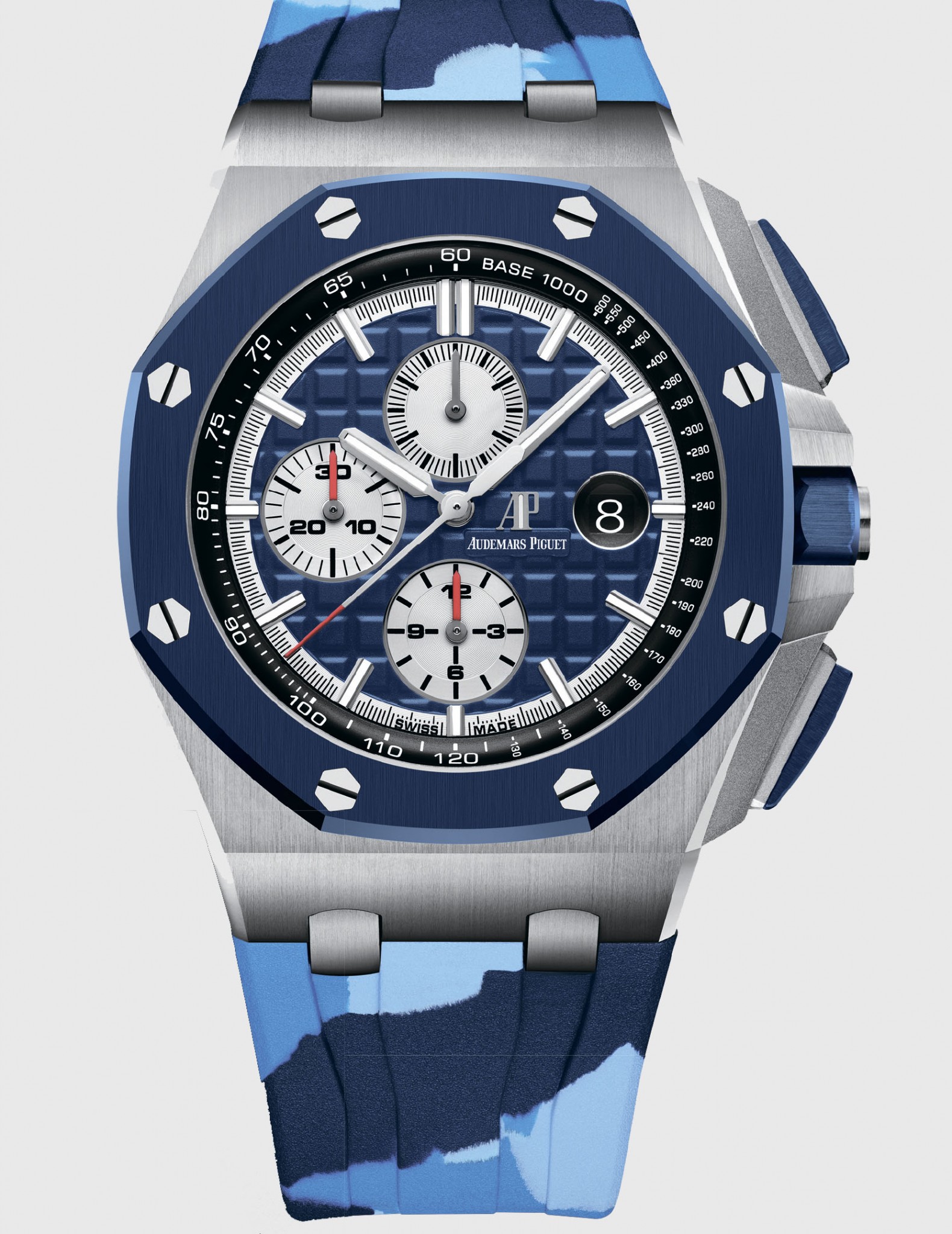 Вот уж действительно: «Нужно мастерски овладеть правилами, чтобы их нарушать». Девиз мануфактуры идеально применим к новинке — культовому хронографу Royal Oak Offshore с автоматическим мануфактурным механизмом, дебютировавшему в камуфляжных расцветках, набирающих в последнее время популярность среди часовых производителей. Чувство меры не изменило марке из Ле-Брассю: камуфляжную окраску приобрели только каучуковые ремешки, а циферблаты ради беспрепятственного считывания показаний оставлены одноцветными, с контрастными счётчиками хронографов. С ремешками и ободками циферблаты сближает общий тон: синий, зелёный (версии в корпусах 44 мм из стали) или коричневый (версия в корпусе 44 мм из розового золота). Ободки, так же как и кнопки хронографа и заводные коронки, выполнены из керамики, и её разноцветье наводит на мысль, что Audemars Piguet преуспела в технологиях производства цветной керамики.
