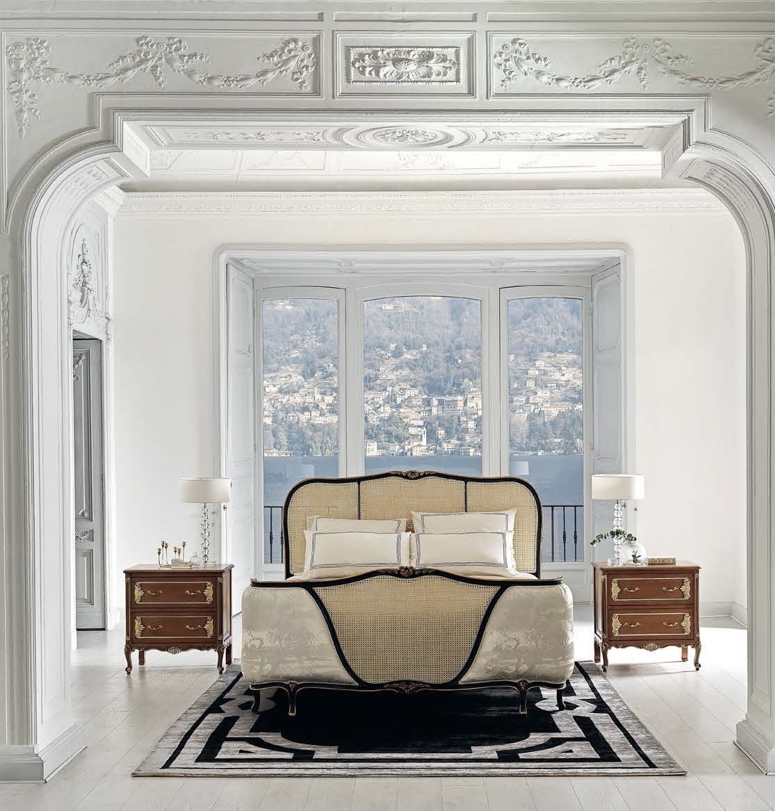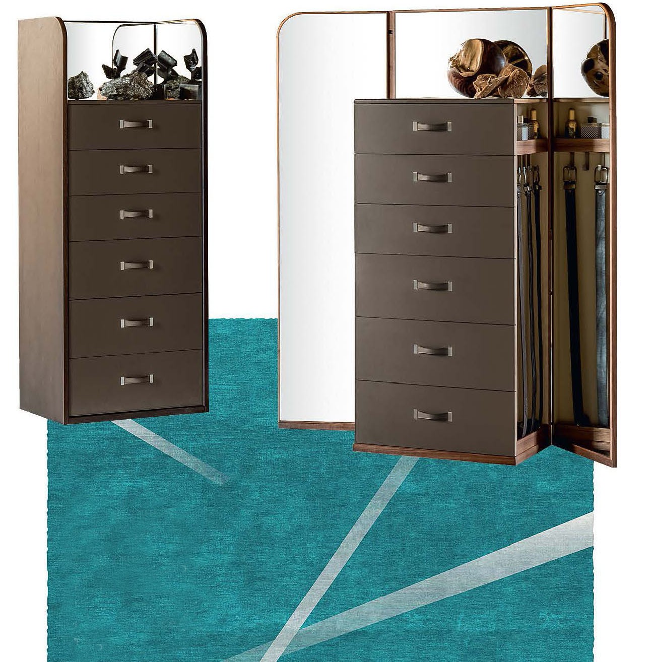 Раскладные зеркала по бокам комода Alivar Giano скрывают боко- вые секции с полками для парфюмерии и вешалками для ремней. Двухцветный ковёр Giorgetti Gradient Refl ex из бамбукового шёлка и льна изготовлен вруч- ную в технике тафтинга.