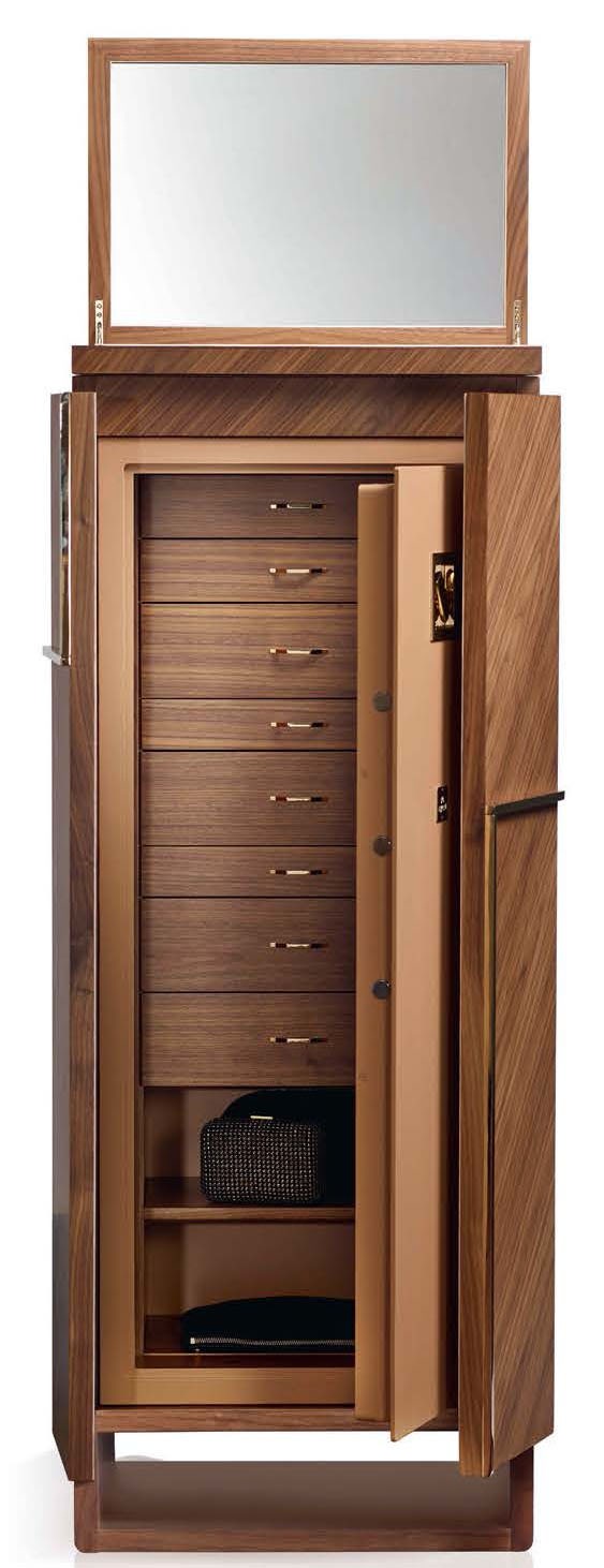 Сейф Agresti для хранения драгоцен- ностей выполнен из орехового дерева каналетто в матовой отделке, фурнитура сделана из латуни, покрытой золотом 24 карата