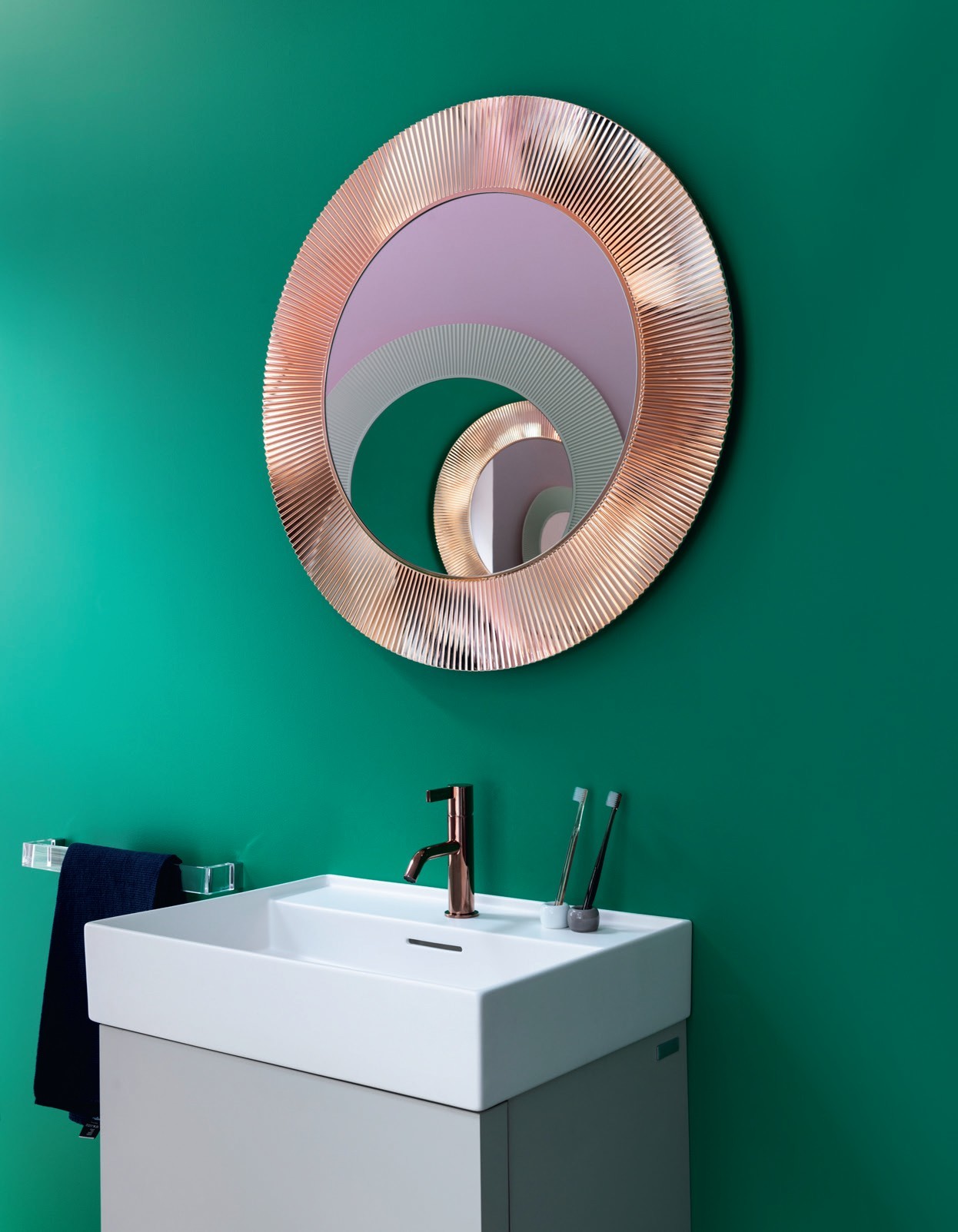 Обновлённая линейка аксессу- аров для ванной комнаты создана Laufen совмест- но с Kartell в яр- кой стилистике 70-х годов
