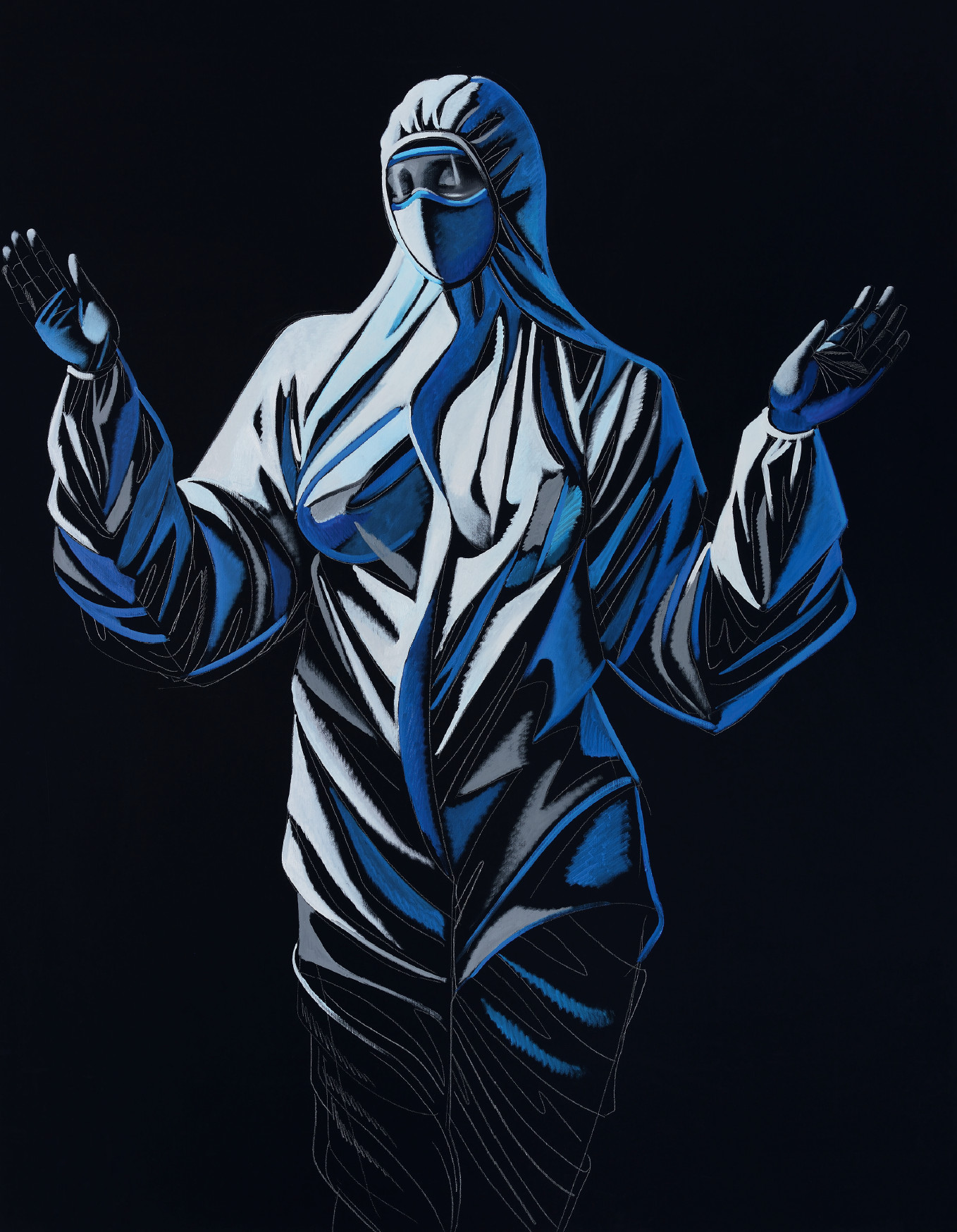 В марте, вернувшись из Италии в Москву, Айдан Салахова оказалась в реабилитационном центре «Царицыно», на её рейсе выявили двух заболевших. О своей изоляции она рассказывала в соцсетях, в популярной группе «Шар и крест» появлялись её рисунки. А живописным итогом карантина стала серия «Новые святые», герои которой — врачи в «космическом» облачении, позировавшие художнице в больнице. «I’ve never seen your faces, but I felt your souls/Я никогда не видела ваших лиц, но я чувствовала ваши души», — написала она в инстаграме (соцсеть признана в РФ экстремистской и запрещена).