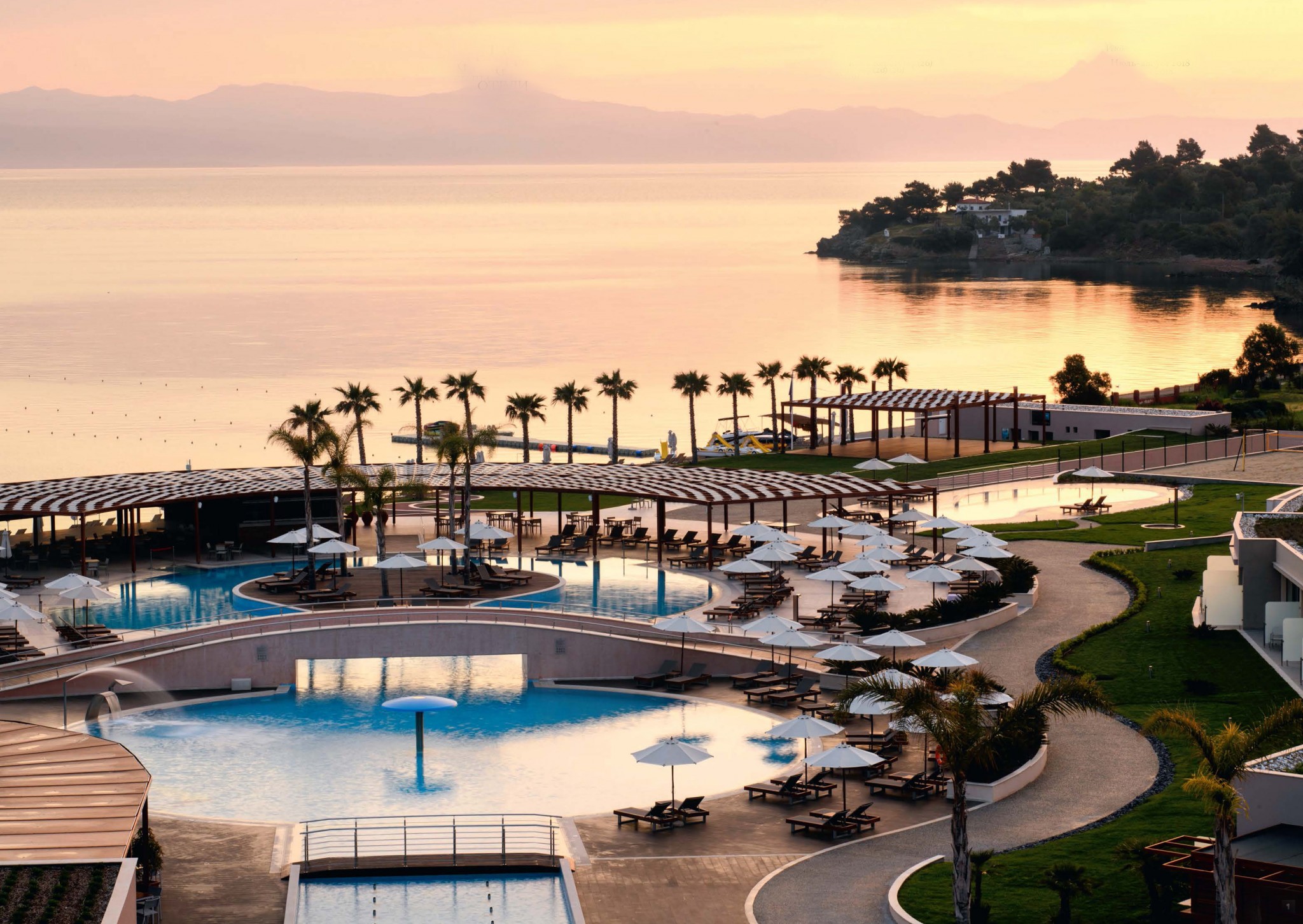Открывшийся три года назад отель в этом сезоне меняет ориентацию. Если изначально это была классическая история для семей с детьми — с анимацией, шведским столом и разучиванием танцев на пляже, то теперь к берегам полуострова Кассандра прибывает (есть своя марина и вертолётная площадка) и солидная публика, которая ценит в отдыхе размеренность оздоровительный эффект. А его обеспечивает один из самых больших в северной Греции спа-комплексов Myrthia Thermal Spa с собственным термальным источником Kanistro — его воды богаты магнием, кальцием, натрием и калием, благоприятно воздействующими на опорно-двигательный аппарат и кожу. Специальные 3–5–7-дневные программы вкупе с водными процедурами, обёртываниями, массажами и фитнесом обещают привести в порядок тело и душу в оптимальные сроки.