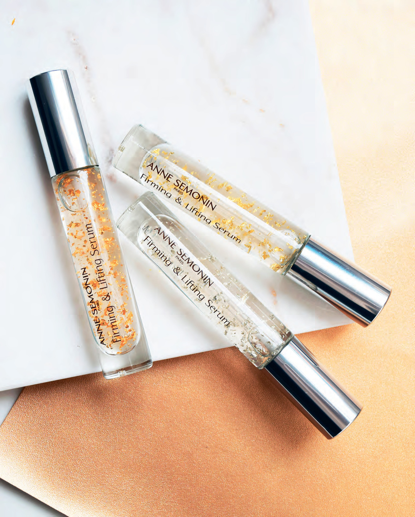 Роскошный сет из трёх укрепляющих и подтягивающих сывороток Ultimate Gold с белым, розовым и жёлтым 24-каратным золотом эффективно борется с признаками старения: потерей упругости и тонуса, тусклым цветом кожи и мимическими морщинами. В этом году в честь 40-летия бренда Anne Semonin обновили формулу легендарного трио. Теперь она содержит инновационные биомиметические пептиды, стимулирующие производство коллагена и уплотняющие кожу, высокотехнологичные полисахариды, «запирающие» влагу изнутри, и, конечно, частички драгоценных металлов — для сияния и ровного тона.