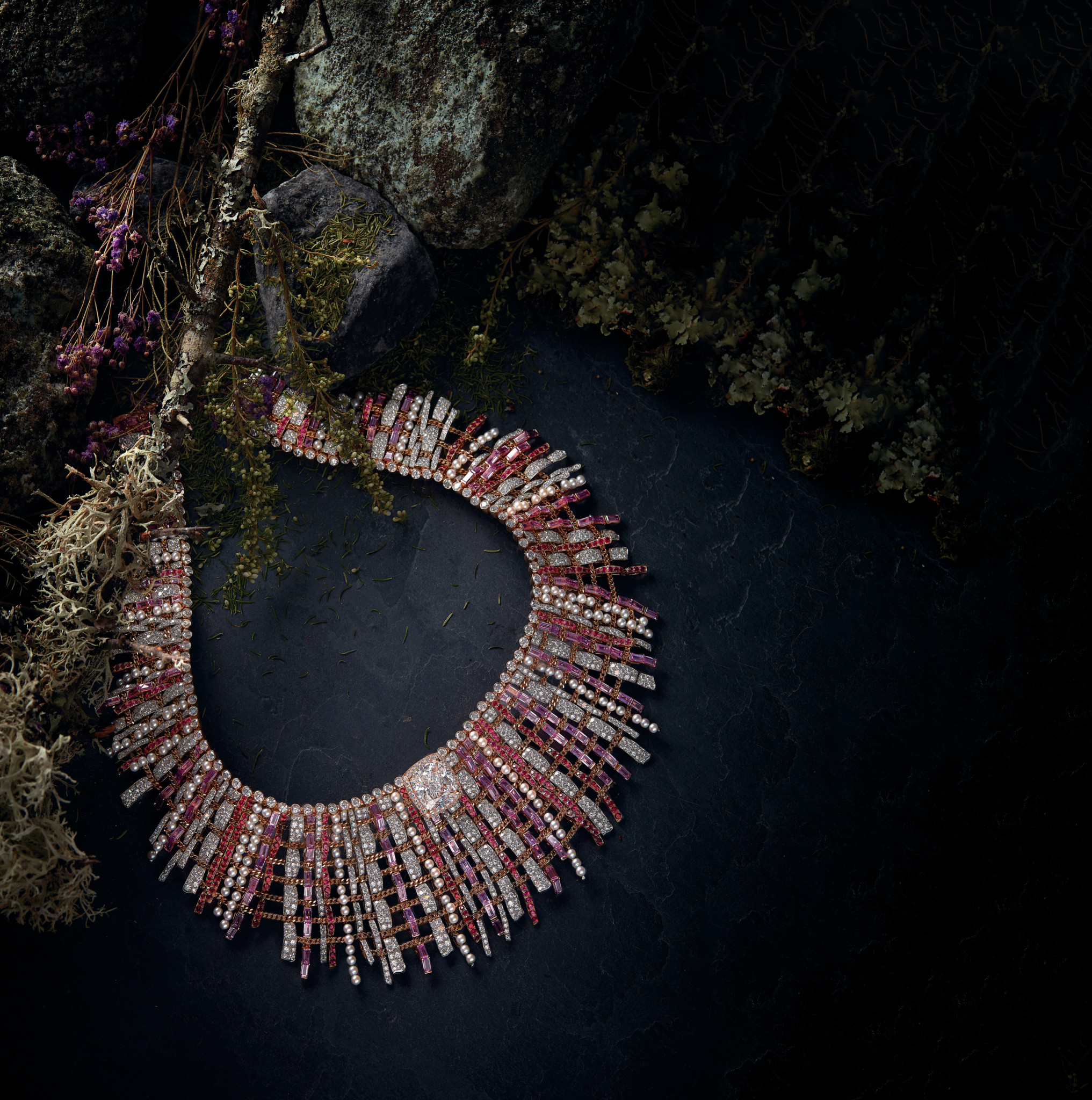 На изготовление колье ушло в общей сложности 1700 часов. Оно украшено белыми бриллиантами, жемчугом, розовыми сапфирами, розовой и красной шпинелью. Цветные камни придают изделию яркость. «Я выбрал розовый, чтобы максимально отразить женственность, — говорит