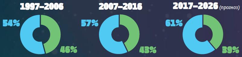 Все больше стран включается в космическую гонку, рассматривая освоение космоса как способ своего стратегического, экономического и технологического развития. В тучный предкризисный 2006-й на космос тратили намного меньше — 40 миллиардов долларов, в 2016-м — больше 60 миллиардов, а в 2026-м ожидают уже 80-миллиардных государственных инвестиций — и это без учета взрывного роста частного сектора, делающего сейчас для развития космической сферы едва ли не больше государств. Если на рубеже веков мировой космический бюджет формировали 50 стран, то сейчас их уже 70, и еще десяток планирует вложиться в освоение космоса в ближайшие годы. Даже маленькие страны и третий мир пытаются инвестировать деньги в космические программы — но США по-прежнему вкладывает в развитие космической отрасли больше, чем весь остальной мир вместе взятый. На второе место в освоении космоса вышел Китай, обогнавший Россию по инвестициям и сравнявшийся с США по количеству запусков. А вот российские инвестиции в космическую сферу рухнули — в 2016 году они были на целых 20% меньше, чем в 2015-м.