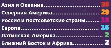 Доля спутников, запущенных с 2006 по 2015 год в разных регионах мира, %