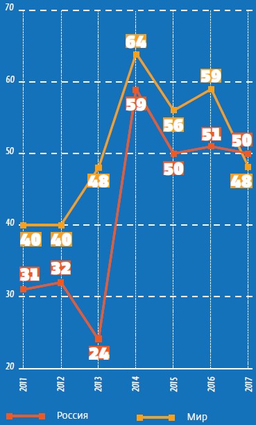 Динамика субъективного уровня счастья в России и в мире согласно опросам Gallup International