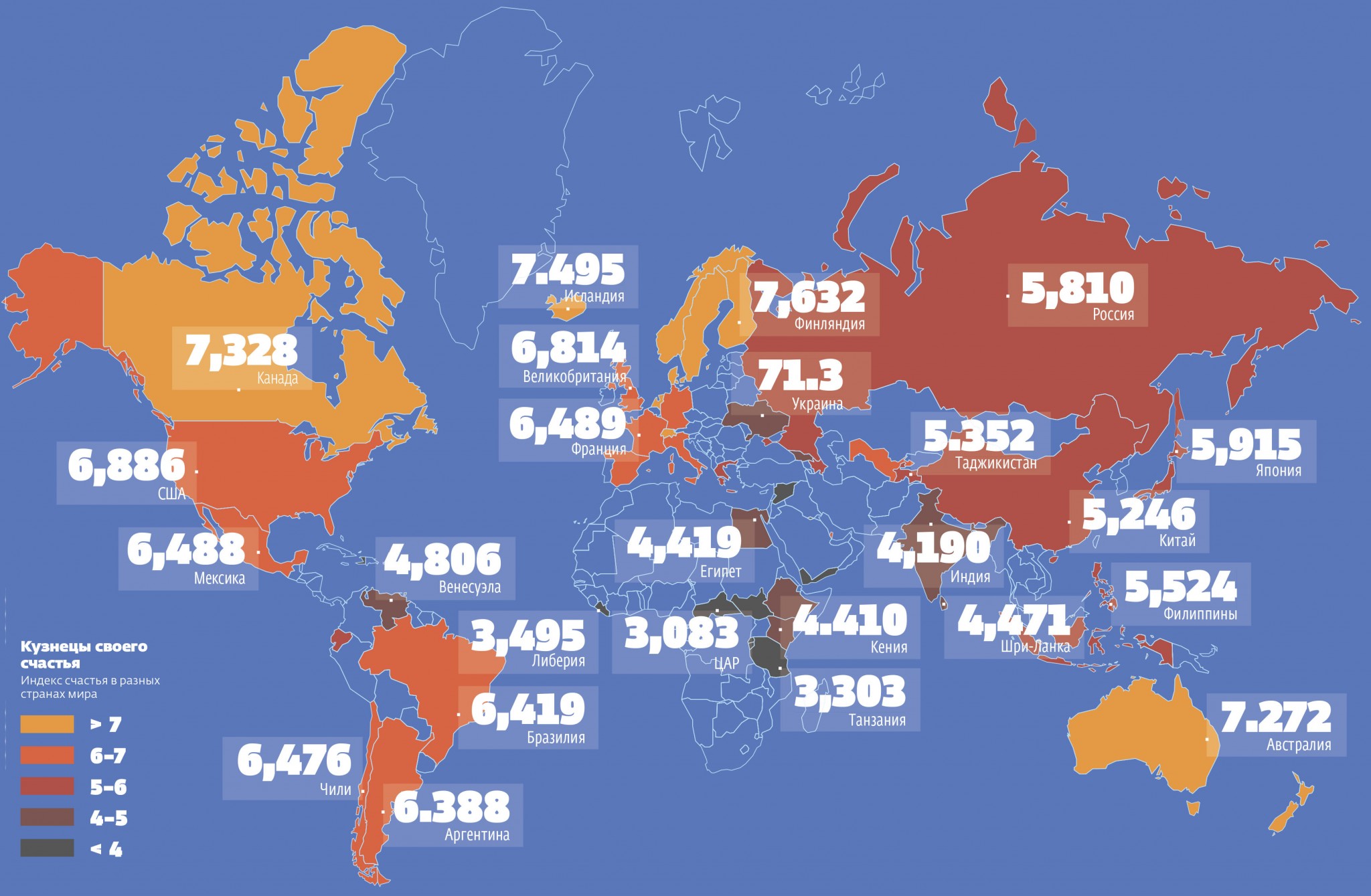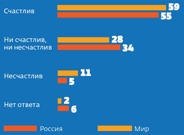 Из чего состоит счастье? У авторов доклада World Happiness Report, который ежегодно публикуется под эгидой ООН, есть очень конкретный ответ на этот вопрос. Индекс счастья учитывает не только субъективную оценку собственного благополучия. Все сложнее: индекс рассчитывается на основе нескольких показателей — по мнению экспертов, для счастья важны уровень ВВП на душу населения, ожидаемая продолжительность жизни, наличие гражданских свобод, чувство безопасности и уверенности в завтрашнем дне, стабильность семей, гарантии занятости, уровень коррупции, а также косвенные показатели состояния общества — уровень доверия, великодушие и щедрость. Уже который год рейтинг возглавляют благополучные скандинавские страны. А вот если ориентироваться только на данные опроса «Счастливы ли вы?», ежегодно проводимого Международным исследовательским центром Гэллапа, то самыми счастливыми себя считают темпераментные жители более жарких мест — Фиджи, Колумбии, Филиппин и Мексики. Но оба исследования солидарны в том, что в России за последние три года уровень счастья не менялся — как и вся планета, счастливее всего мы были в 2014 году (возможно, по разным причинам), а в 2015-м резко почувствовали себя хуже. Сейчас среднестатистич еский россиянин чуть счастливее среднестатистического жителя планеты.