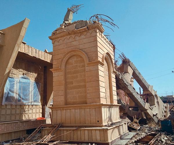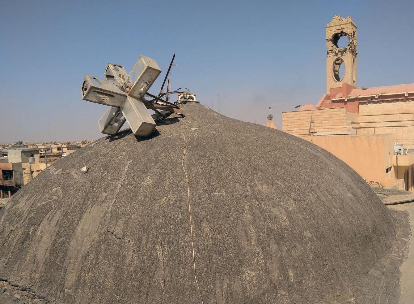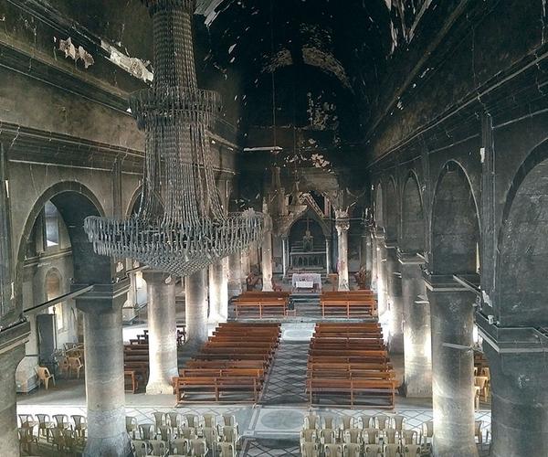 Церкви боевики использовали для размещения своих штабов и учреждений — ведь это самые пышные и крупные здания в городе. В сиро-католической церкви Непорочности, одной из старейших в городе, размещался тренировочный центр. До сих пор на стенах остаются надписи на арабском с лозунгами ИГ и нарисованные от руки флаги террористической организации.