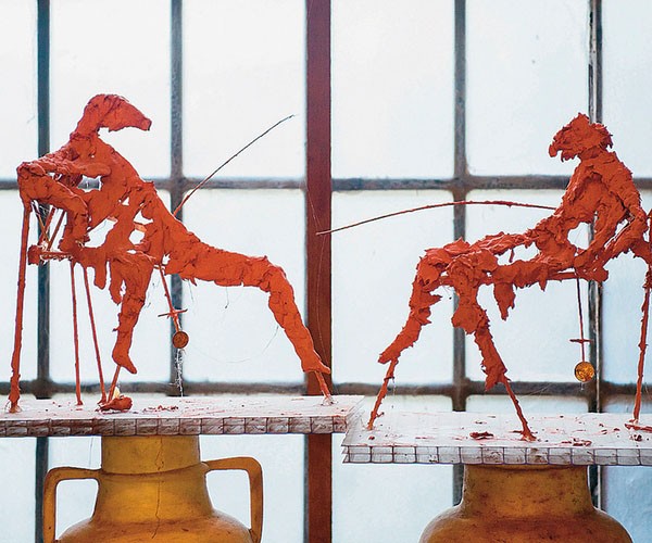 — Все мои картинки, эскизы. Недавно я сделал открытие: взял старую книжку 2000 года с рисунками и увидел, что какой-то мерзавец, который жил здесь без меня три дня, вырвал из книги страницы и уничтожил. Он назвал рисунки чертовщиной. И тут я понял, что все рисунки надо переводить в скульптуры. Два терракотовых персонажа, что стоят на подоконнике, когда-то были нарисованы. Я хочу у себя в сыпке сделать по этим маленьким моделям скульптуры три на шесть метров, отфактурить их под металл, а затем собрать пресс-конференцию.