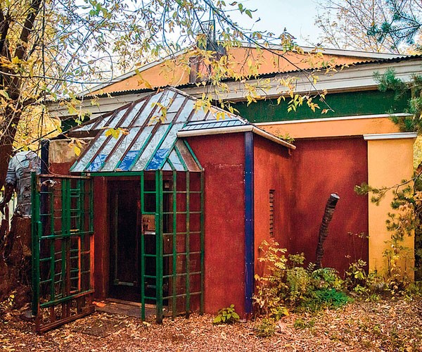 К домику терракотового цвета на Студенческой — бывшей трансформаторной будке, овитой листьями, — не подступиться. Гудит грузовик, и рабочие с лопатами ремонтируют трубы и латают дорогу. Теодор Тэжик в серой вязаной шапочке с полями оттягивает железные ворота высотой ниже колен — условное ограждение от этих монотонных раздражающих шумов в духе «Кин-дза-дза». У входной двери стоит уже подлинный предмет планеты Плюк — длинная изогнутая труба. В коридоре, задыхаясь от лая, скачет лабрадор Карл.