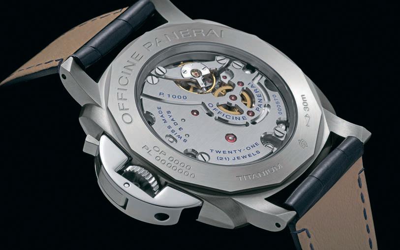 На работу модели можно полюбоваться изнутри: механизм с обратной стороны закрыт прозрачным сапфировым стеклом, через которое видна каждая деталь калибра. Механизм полностью произведен на мануфактуре Panerai, оснащен ручным заводом и запасом хода в три дня. Особая конструкция также обеспечивает водонепроницаемость модели при давлении до 3 бар (примерно на 30 метрах глубины).