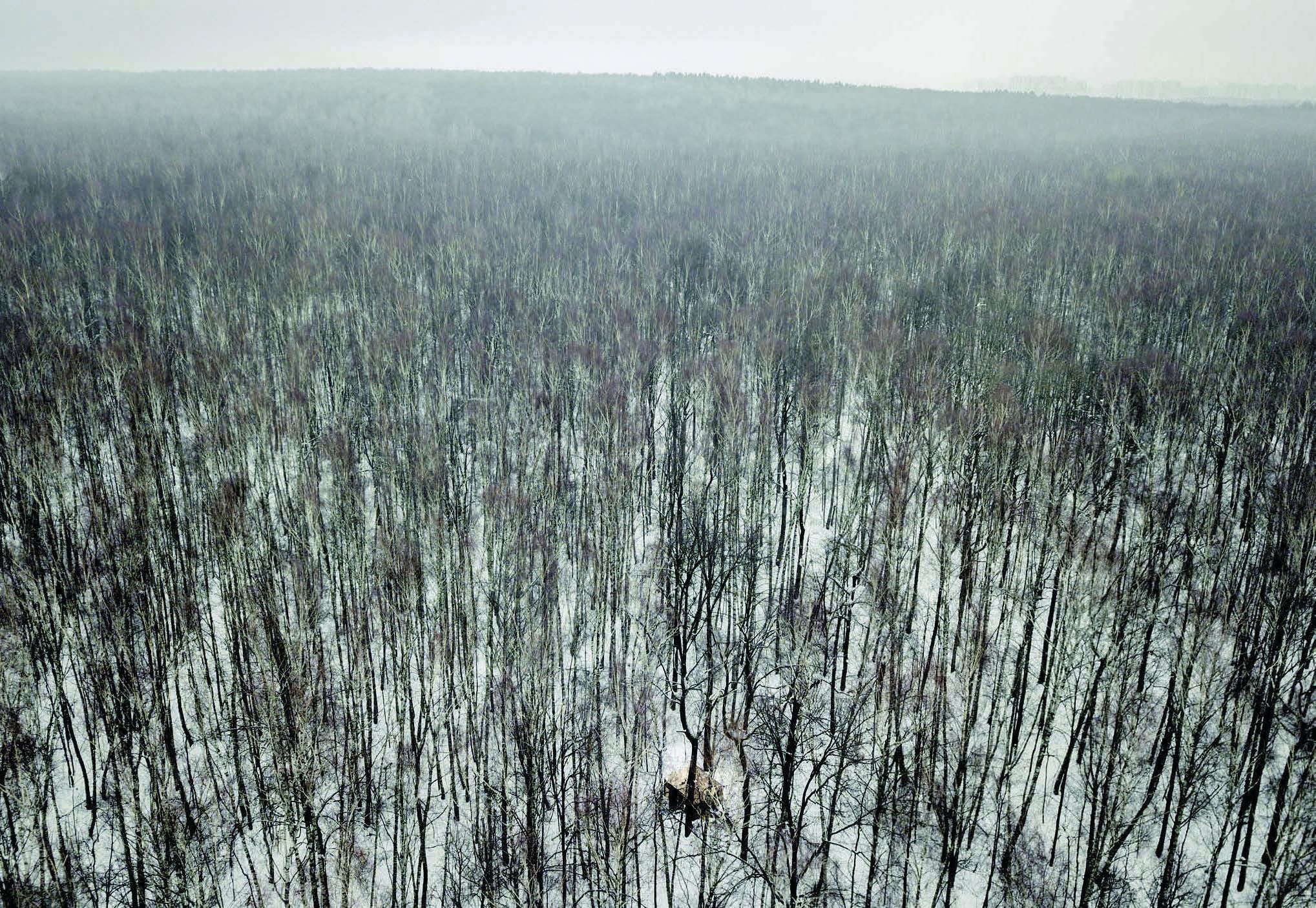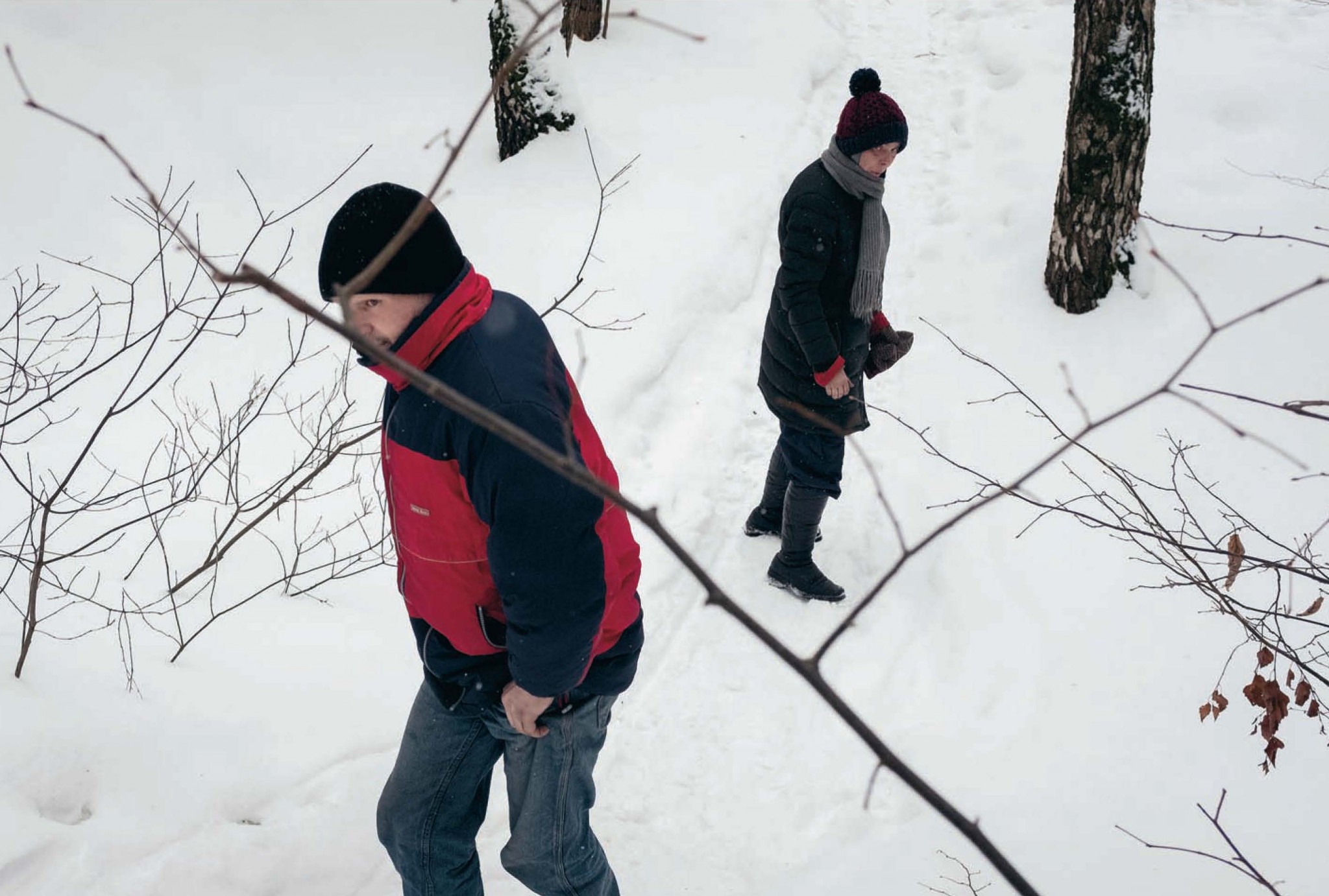 Впереди по узкой тропке, протоптанной в снегу, идут двое — мужчина и женщина в свалявшейся шапке с помпоном. В начале леса, встающего от трассы, кусты в снегу обведены желтой собачьей мочой. Редко стоят березы. Почерневший борщевик поднимается выше человеческого роста. Дальше снег становится чище. Мужчина с женщиной идут и идут, не переговариваясь на ходу, пока не показывается впереди сарай, по крышу утопленный в снегу, а поодаль — крошечный домик, окруженный загустевшими березами. И кажется, березы рассыпавшимся хороводом сбегают от него.