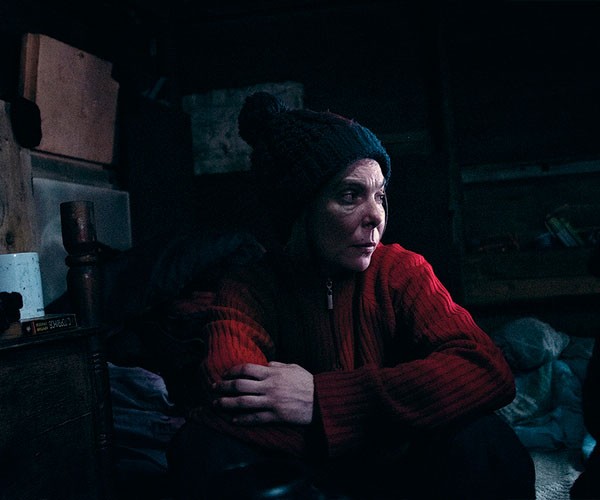 Женщина садится на лежак, заваленный сальным бельем, и смотрит пристально на диван. Она не снимает ни шапку, ни капюшон под ней. Ее лицо со вздернутым носом, голубыми замороженными глазами, черной от сажи кожей явственно выдает человека, который давно обитает на улице. И я понимаю, что в поисках приличной семьи с детьми забрела в домик обычных, ничем не выдающихся бомжей. Впрочем, саночки у домика и шевелящееся одеяло позволяют предположить: дети тут все же есть.