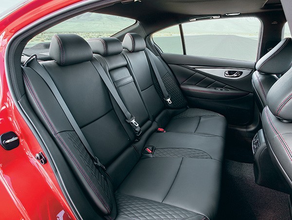 Как и в других моделях Inifiniti, салон встречает объятиями передней панели и мягкой кожей кресел. При этом интерьер седана был и остался цифровым, а центром притяжения салона является центральная консоль с двумя полноценными сенсорными дисплеями медиасистемы InTouch. Верхний отвечает за навигацию, радио и путевую информацию; при помощи нижнего удобно настраивать бортовые системы и медийные функции машины. Он же позволил убрать ряд кнопок, хотя физические клавиши управления климатической установкой и основными функциями аудиосистемы все-таки сохранились. Управлять навигацией можно при помощи вращающейся шайбы на консоли, рядом с которой расположился селектор выбора режимов движения. Еще один цветной дисплей расположен между циферблатами приборов.