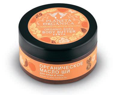 Масло ши получают из косточек ореха дерева карите, растущего в некоторых регионах Африки. Местные его ценят, называют «деревом жизни» и используют в приготовлении пищи, производстве лекарств и мыла. Planeta Organica предлагает использовать масло ши для ухода за кожей. И не зря: оно содержит много жирных кислот, помогающих сохранить влажность и эластичность. Каристеролы способны активировать синтез коллагена, обеспечивая регенерацию — восстановление ткани. Регулярное использование масла карите улучшит цвет кожи, уплотнит ее текстуру, повысит тонус и упругость. Запах ши — легкий, нечто среднее между ароматом кокосового и грецкого орехов. Кстати, в Кении это масло давно используют для защиты от палящего солнца, так что в отпуске такая баночка тоже может пригодиться.