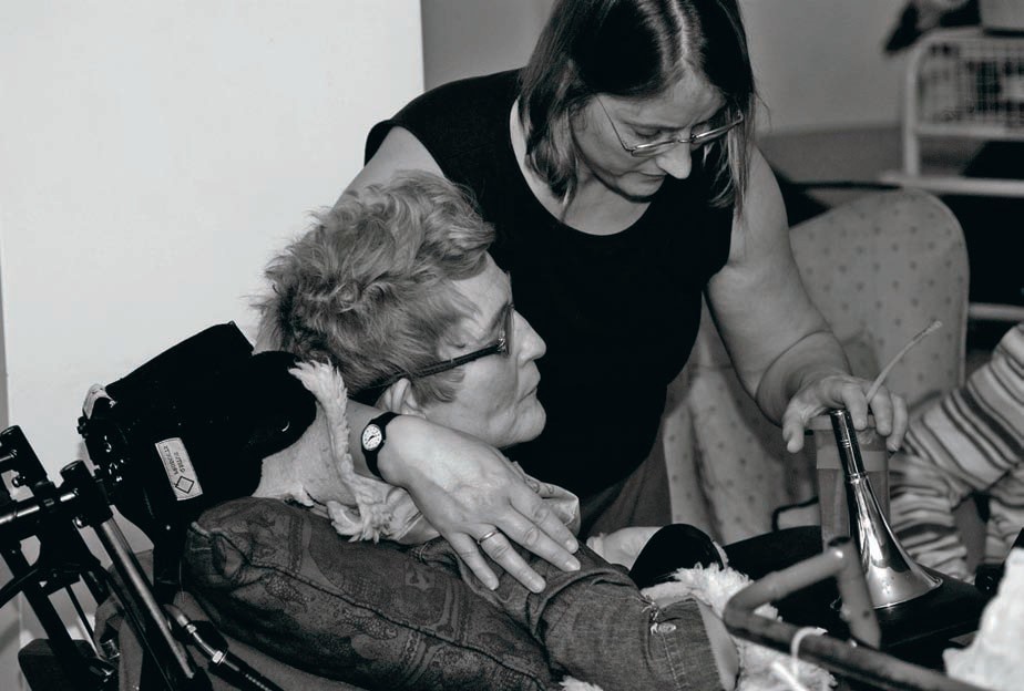Укрепить связь между больными и обслуживающим персоналом — тоже часть курса. До болезни пациенты вели полноценную во всех смыслах жизнь: у многих из них были работа, семья, большой круг знакомых, — но теперь некоторые не могут выговорить даже одного предложения. И потому санитары, медсестры, сиделки, которые проводят с больными большую часть времени, воспринимают их как не совсем живых. Но на сеансе они видят, как с помощью музыки в их подопечных проявляется здоровое начало, что позитивно влияет на их взаимоотношения.