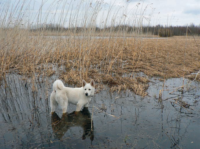 Промоина ведет к озеру, вода чистая, на дне красно-золотистая торфяная взвесь. По воде идти гораздо легче, чем по лугу. Белый шуршит в тростниках. Оскар сетует на ветер, что пес загнал птиц в укрытия, и фотографирует кроншнепа, выпь, ястреба-перепелятника высоко в небе, аиста над деревней, болотного луня над полем.