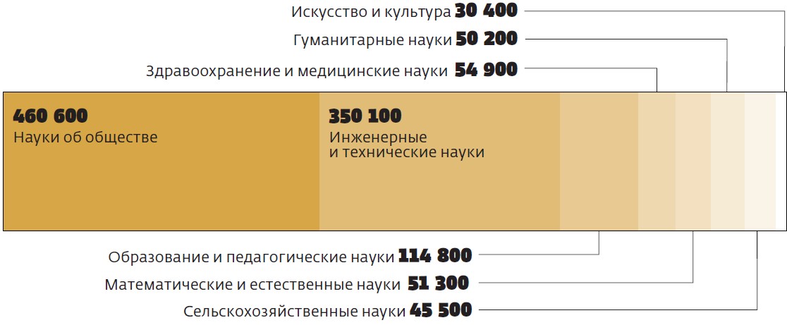 Более миллиона абитуриентов поступили в российские вузы в 2016 году, сообщается в сборнике «Образование в цифрах: 2018», выпущенном Институтом статистических исследований и экономики знаний НИУ ВШЭ. Почти половина учащихся все еще идет в юристы и экономисты (на диаграмме — «науки об обществе»).