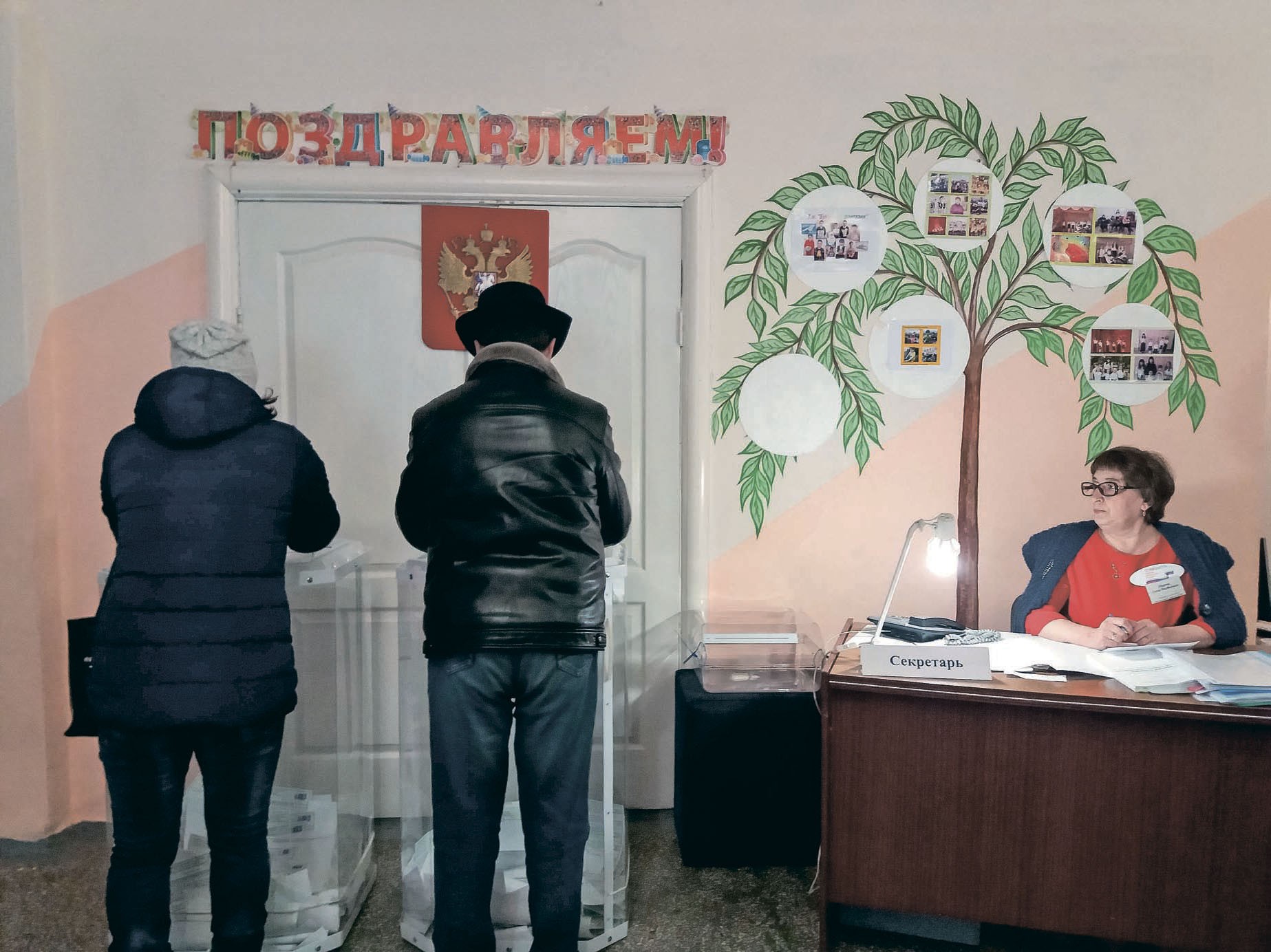 В восемь вечера участок № 886 закрывают на ключ, чтобы считать голоса. Николай Михайлович наблюдает за подсчетом, прислонясь к дверному косяку, но оставаясь в коридоре. Пошли первые результаты. Звонят из поселка Уфимка: Путин — 100, Грудинин — 15. Николай Михайлович очень надеется.