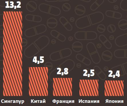 Общее потребление антибиотиков в ряде стран (стандартные единицы, 2010 год)