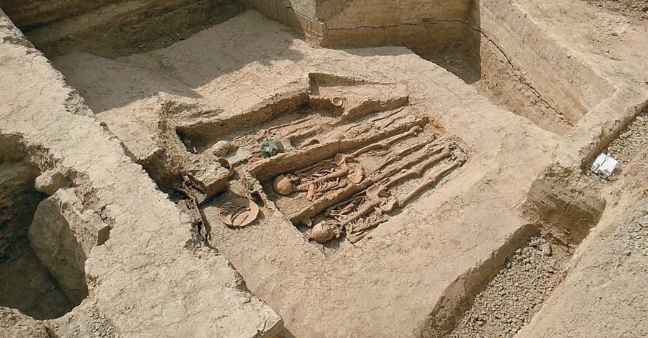Спускаемся, по сторонам глубокие ямы, в каждой из них работает археолог. Рядом под слоем глины кое-где видны кости. Гробы с костями, крышки гробов.