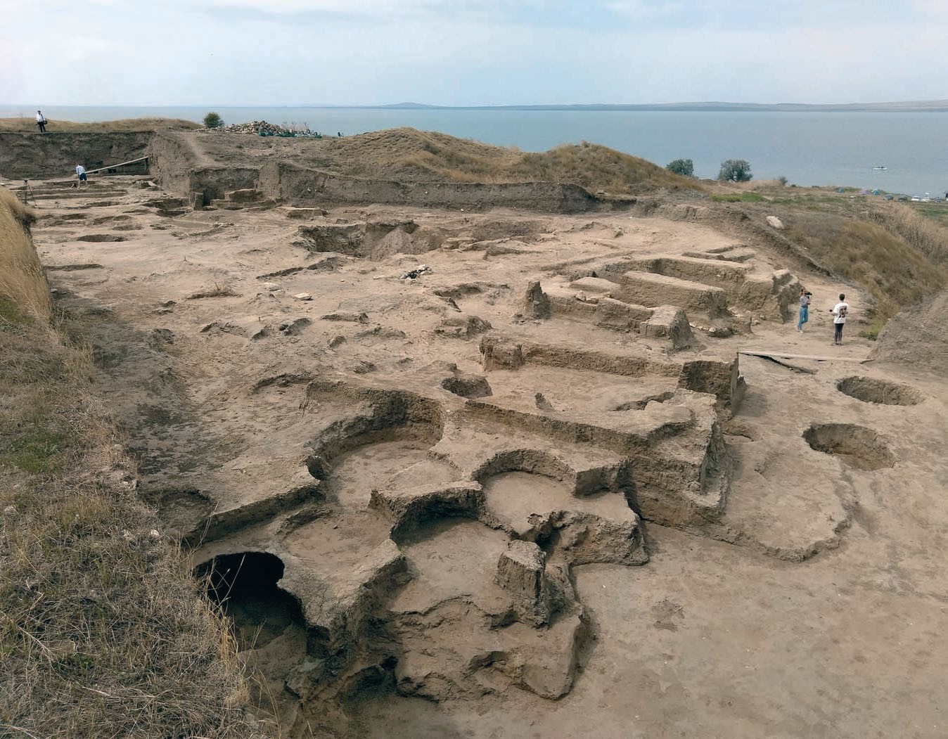 Из нижнего раскопа, который приоткрывает нам завесу тайны гибели города, Алексей Завойкин ведет к верхнему раскопу, занимающему 3000 квадратных метров. На круче сильный ветер, а пред нашим взором настоящие улицы и какие-то ямы овальной формы.