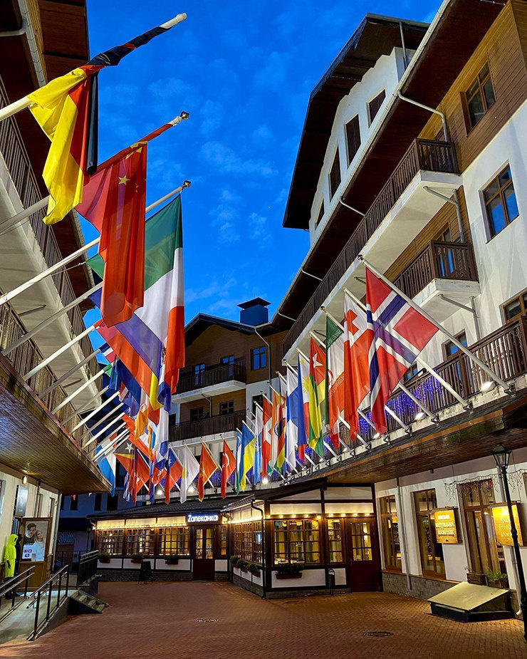 Наследие Зимних Олимпийских игр 2014, симпатичная улица с вывешенными флагами стран-участниц находится в Горной Олимпийской деревне на плато на высоте 1170 м. Деревню строили к Олимпиаде, именно здесь в домиках в альпийском стиле жили спортсмены во время соревнований. Сейчас эти шале переоборудованы под гостиницы, рестораны и магазины. Сюда можно подняться на канатной дороге. Кстати, рядом со станцией Роза Плато установлены олимпийские кольца – тоже отличная локация для фотографий.