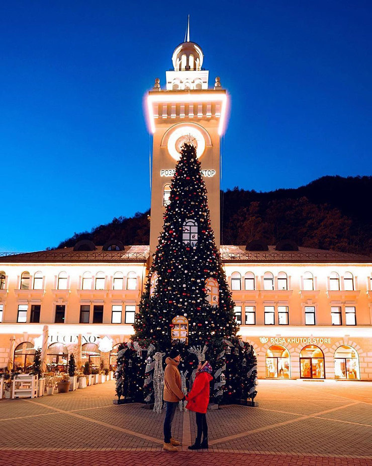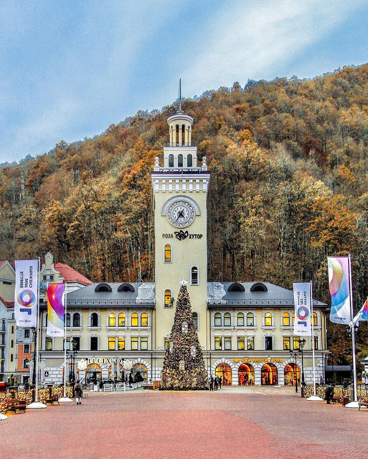 Центральная и, пожалуй, самая популярная площадь курорта расположена в Роза Долине на высоте 560 м над уровнем моря. На ней находится та самая узнаваемая Ратуша с часами, здесь назначают встречи, проводят праздники и ставят новогоднюю елку. Экскурсоводы говорят, что фото на фоне Ратуши приносит удачу, но этого мы гарантировать не можем. Здесь же протекает бурная река Мзымта. Через нее перекинуты пять живописных мостов: Романов, Олимпийский, Мишкин, Барсов и Пешков, а на обоих берегах разместились гостиницы, рестораны, кафе и сувенирные магазины. Наверх ведут канатные дороги.