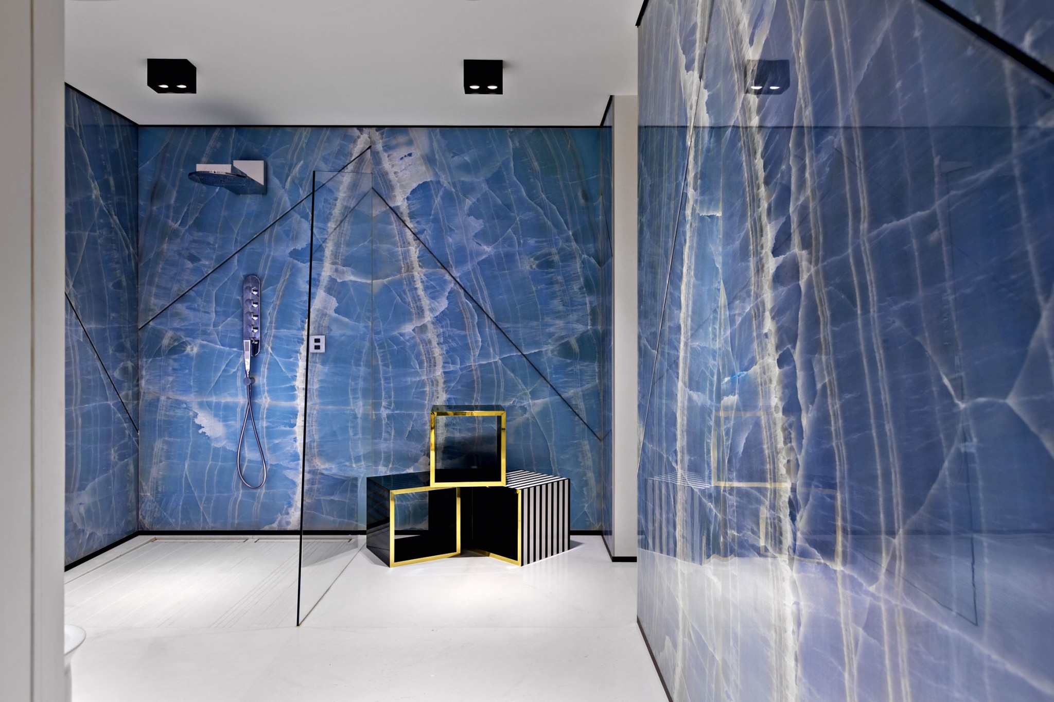 Для концептуального интерьера, где главную роль играл цвет, ванную решено было сделать голубой. Её стены выложены ониксом с белыми прожилками, в нём присутствуют нужные нам оттенки и природный рисунок. Огромные слэбы разрезали, а швы в камне декорировали тонкими чёрными вставками из металла. Этот вынужденный приём стал выразительным элементом дизайна».