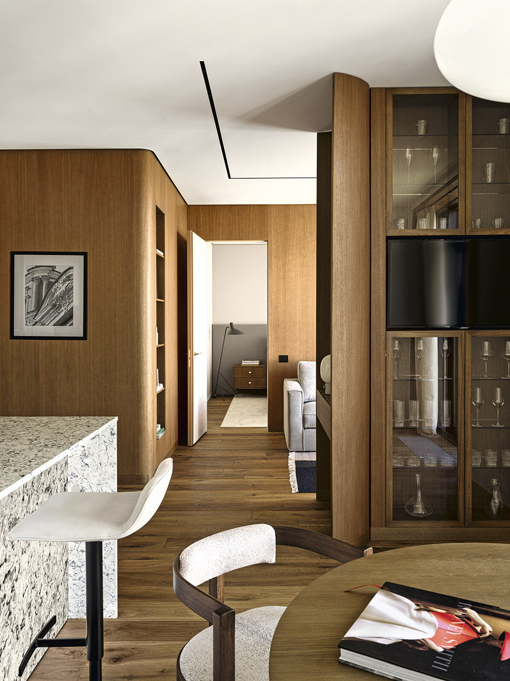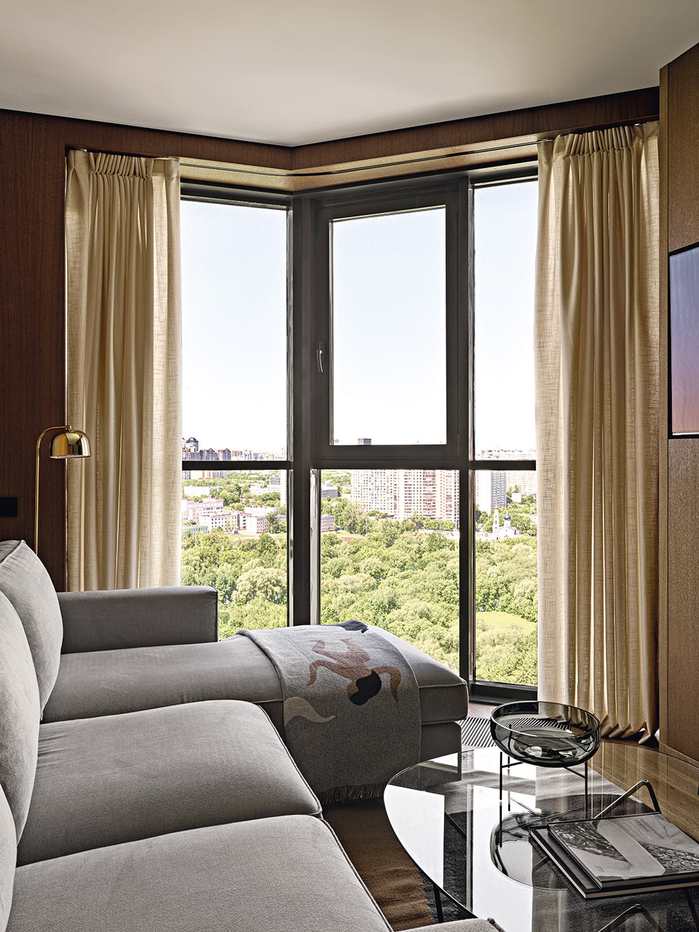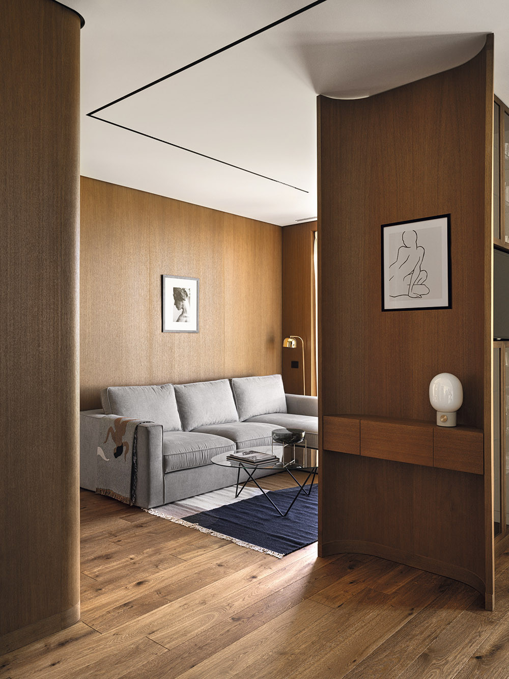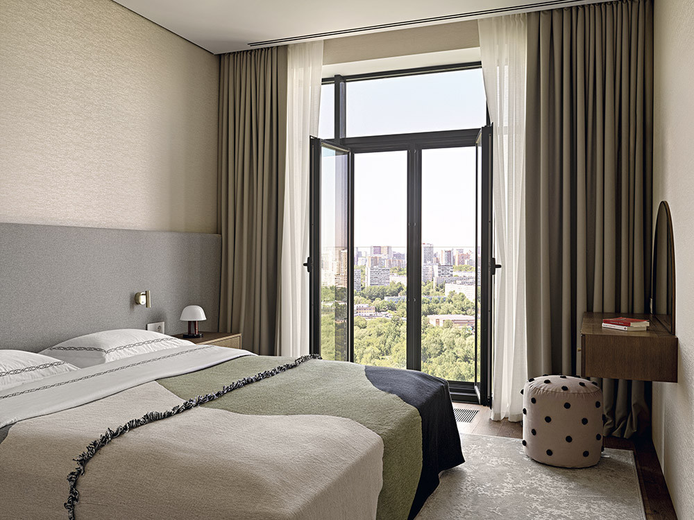 Мария признается, что в своих проектах часто использует дерево, стекло, фактурные обои, любит наполнять пространство искусством, уникальными винтажными предметами, создающими правильный настрой и контекст. В данном случае предметом особой гордости стало разработанное бюро решение для зонирования пространства, которое назвали «функциональный простенок». На сегодняшний день он является украшением объекта, местом притяжения и в то же время выполняет функцию буфета, телестены, декоративной консоли и местом установки новогодней елки. Облицовка оконных проемов деревянными панелями в в зоне гостиной выполнена виртуозно, направляющие штор скрыты в монтажной конструкции стеновых панелей, что позволило добиться эффекта монолитности стенового покрытия и сделать зону гостиной особенно торжественной. Благодаря продуманной совместно с заказчиками карте перемещений, место хранения организовано таким образом, что оно никак не привлекает к себе внимание и позволяет создать комфортную траекторию движения внутри квартиры. «Запрос нового времени, — говорит автор проекта, — состоит в том, чтобы при сокращении жилых площадей застройщиком сохранить необходимый функционал для наших заказчиков. Этот объект стал амбассадором реализации в проектах роскоши будущего».