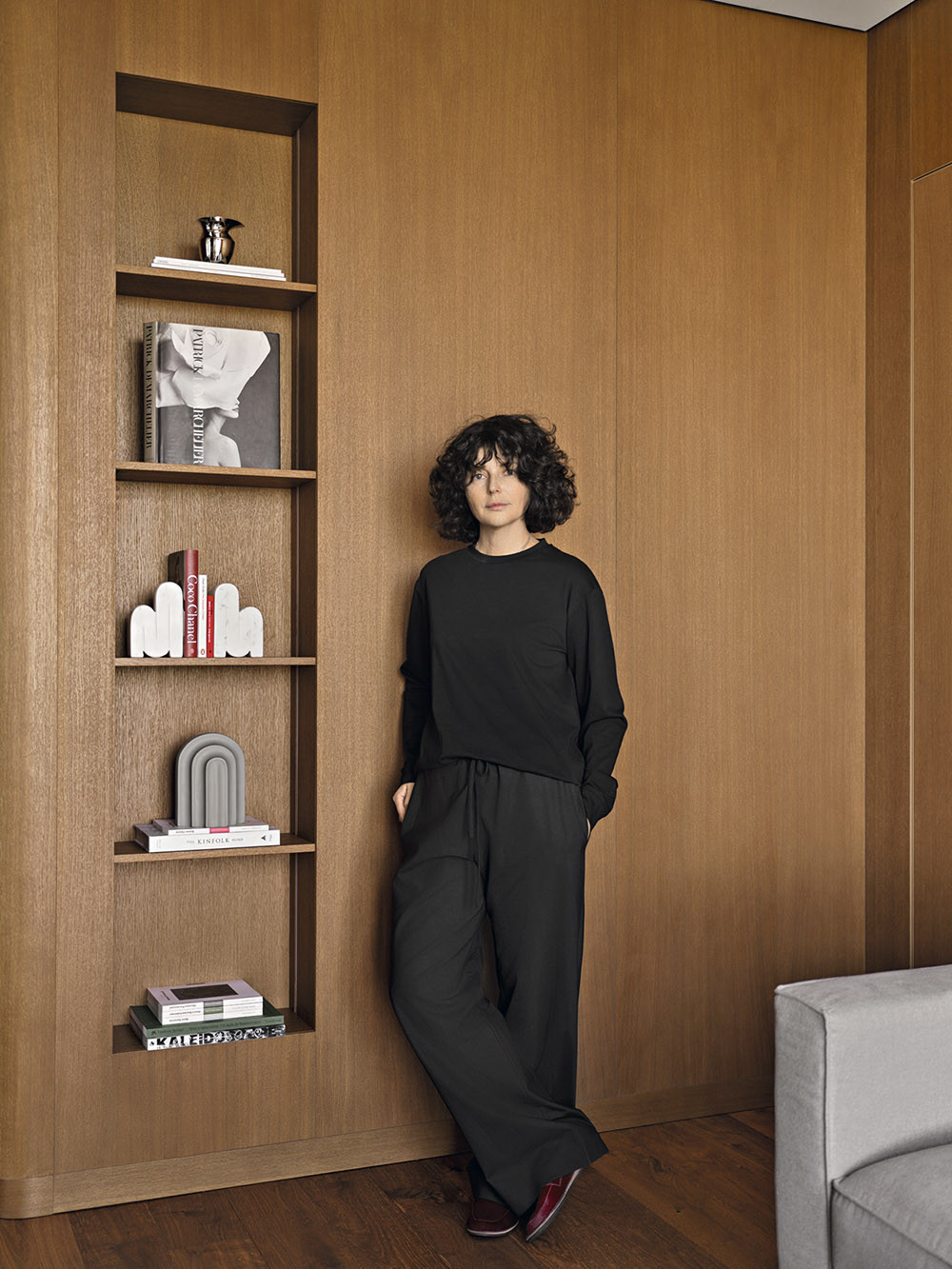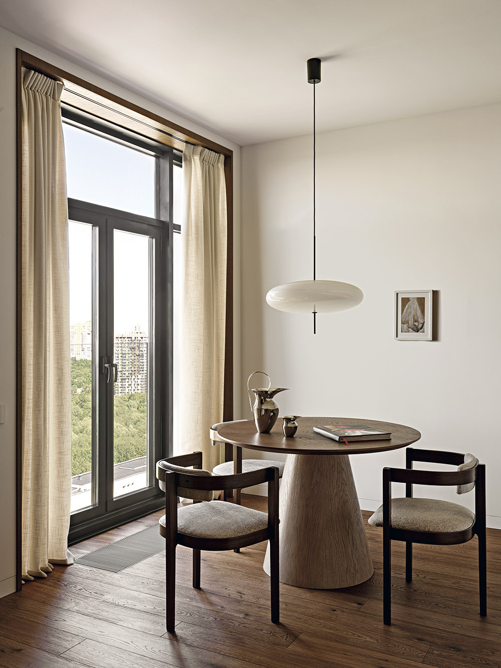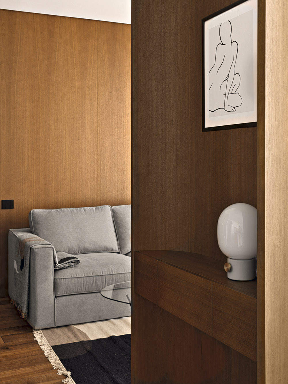 Мария признается, что в своих проектах часто использует дерево, стекло, фактурные обои, любит наполнять пространство искусством, уникальными винтажными предметами, создающими правильный настрой и контекст. В данном случае предметом особой гордости стало разработанное бюро решение для зонирования пространства, которое назвали «функциональный простенок». На сегодняшний день он является украшением объекта, местом притяжения и в то же время выполняет функцию буфета, телестены, декоративной консоли и местом установки новогодней елки. Облицовка оконных проемов деревянными панелями в в зоне гостиной выполнена виртуозно, направляющие штор скрыты в монтажной конструкции стеновых панелей, что позволило добиться эффекта монолитности стенового покрытия и сделать зону гостиной особенно торжественной. Благодаря продуманной совместно с заказчиками карте перемещений, место хранения организовано таким образом, что оно никак не привлекает к себе внимание и позволяет создать комфортную траекторию движения внутри квартиры. «Запрос нового времени, — говорит автор проекта, — состоит в том, чтобы при сокращении жилых площадей застройщиком сохранить необходимый функционал для наших заказчиков. Этот объект стал амбассадором реализации в проектах роскоши будущего».